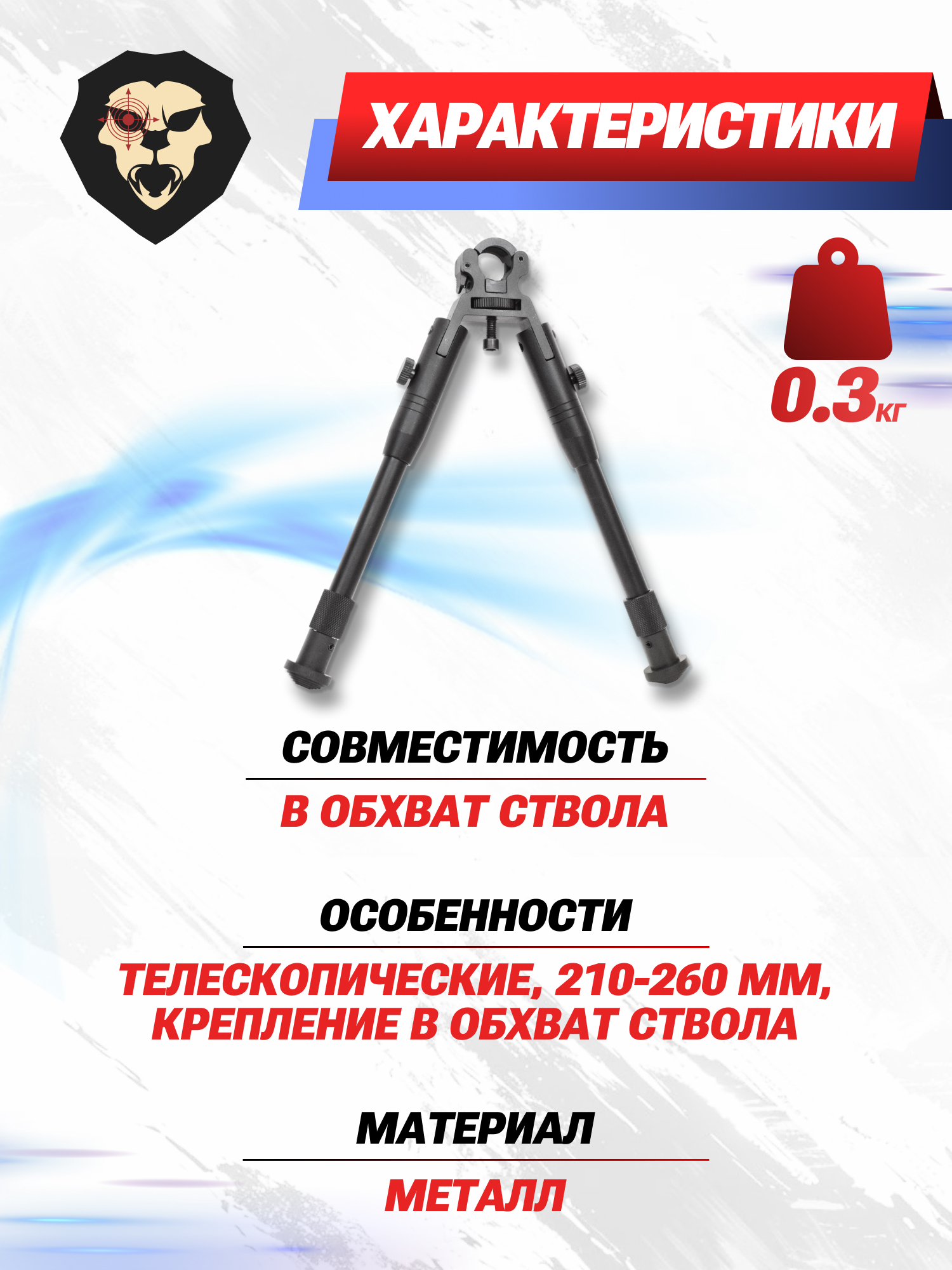 Для добавления тактических возможностей образец наделен телескопическим строением, раскладывание путем снятия блокировки на каждой ножке займет не дольше секунды. Такое решение добавляет функционала наряду со складыванием вдоль оси ствола при переноске или смене позиции. Высота сошек Патриот регулируется от 210 до 260 миллиметров.