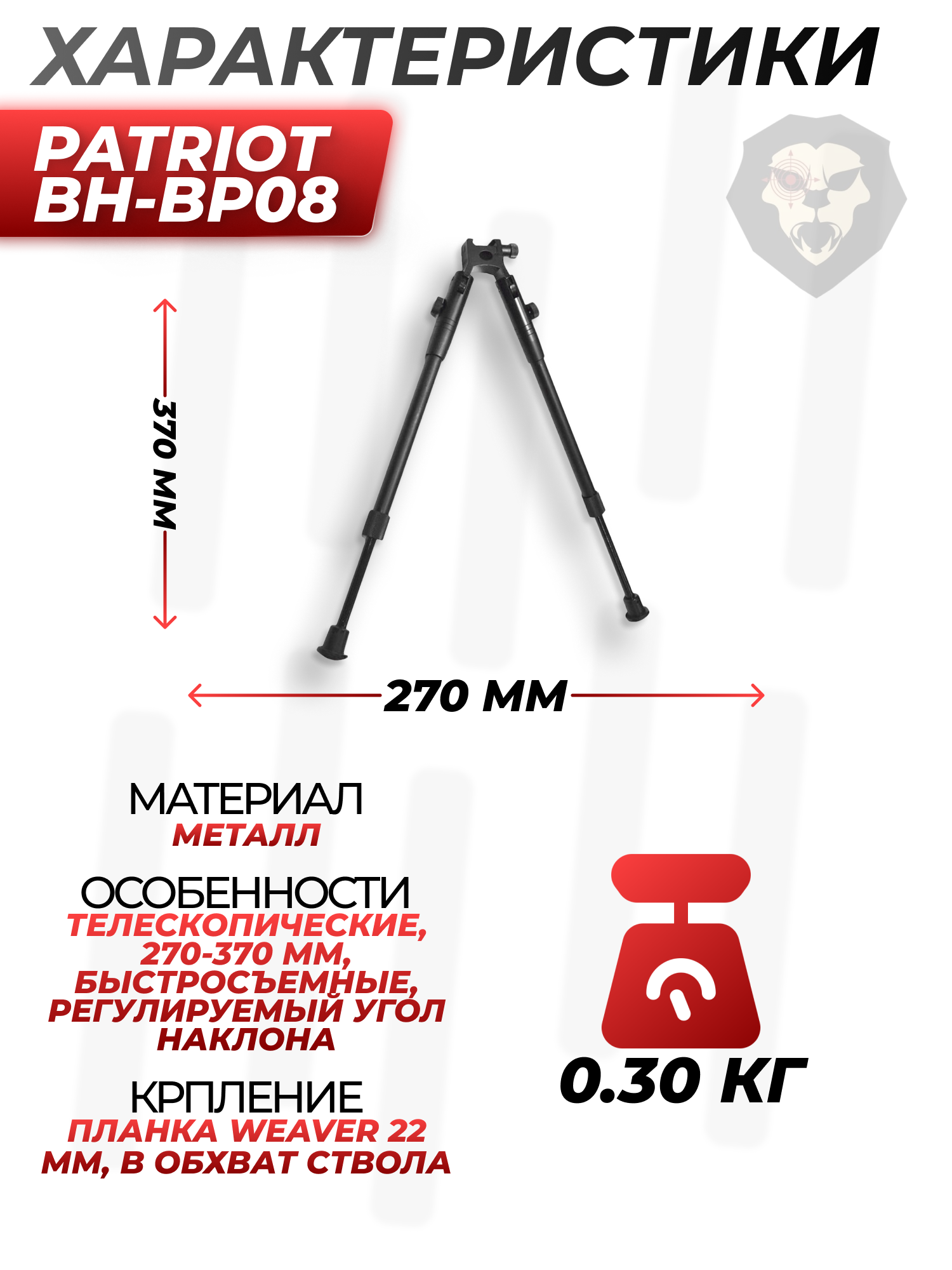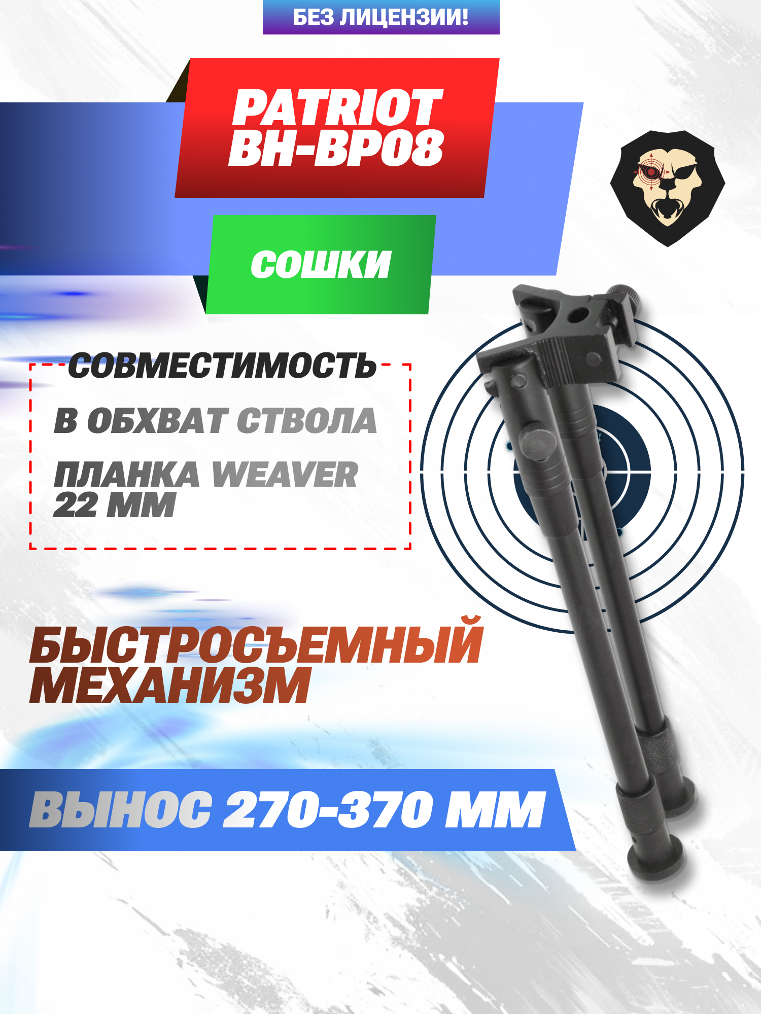 Артикул производителя BH-BP08 Сошки Patriot BH-BP08 (Weaver, на ствол, быстросъемные) по низкой цене 2390 руб. Модель со штрихкодом производителя Вы можете оплатить наложенным платежем с доставкой или в отделении транспортной компании (ПЭК, СДЭК, Boxberry). Ваш заказ со штрихкодом 2000000050706 забрать на почте с оплатой при получении в любой части Российской Федерации.
