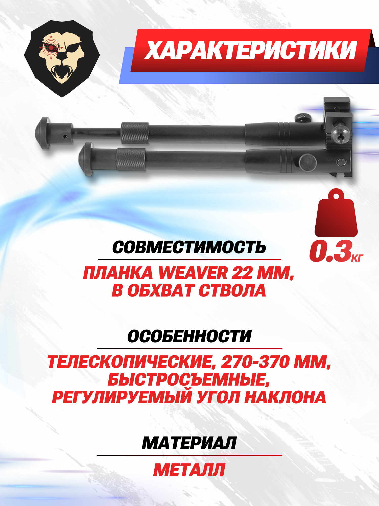 Представленная модель обладает телескопическими ножками, регулировка которых выполняется в диапазоне 27-37 см. Кроме прочего, сошки настраиваются по необходимому углу наклона, благодаря храповому механизму с фиксатором в основании. Наконечники упоров характеризуются наличием расширительных колпачков, выполненных из нескользящего пластика, повышающего устойчивость конструкции на неровной поверхности.
