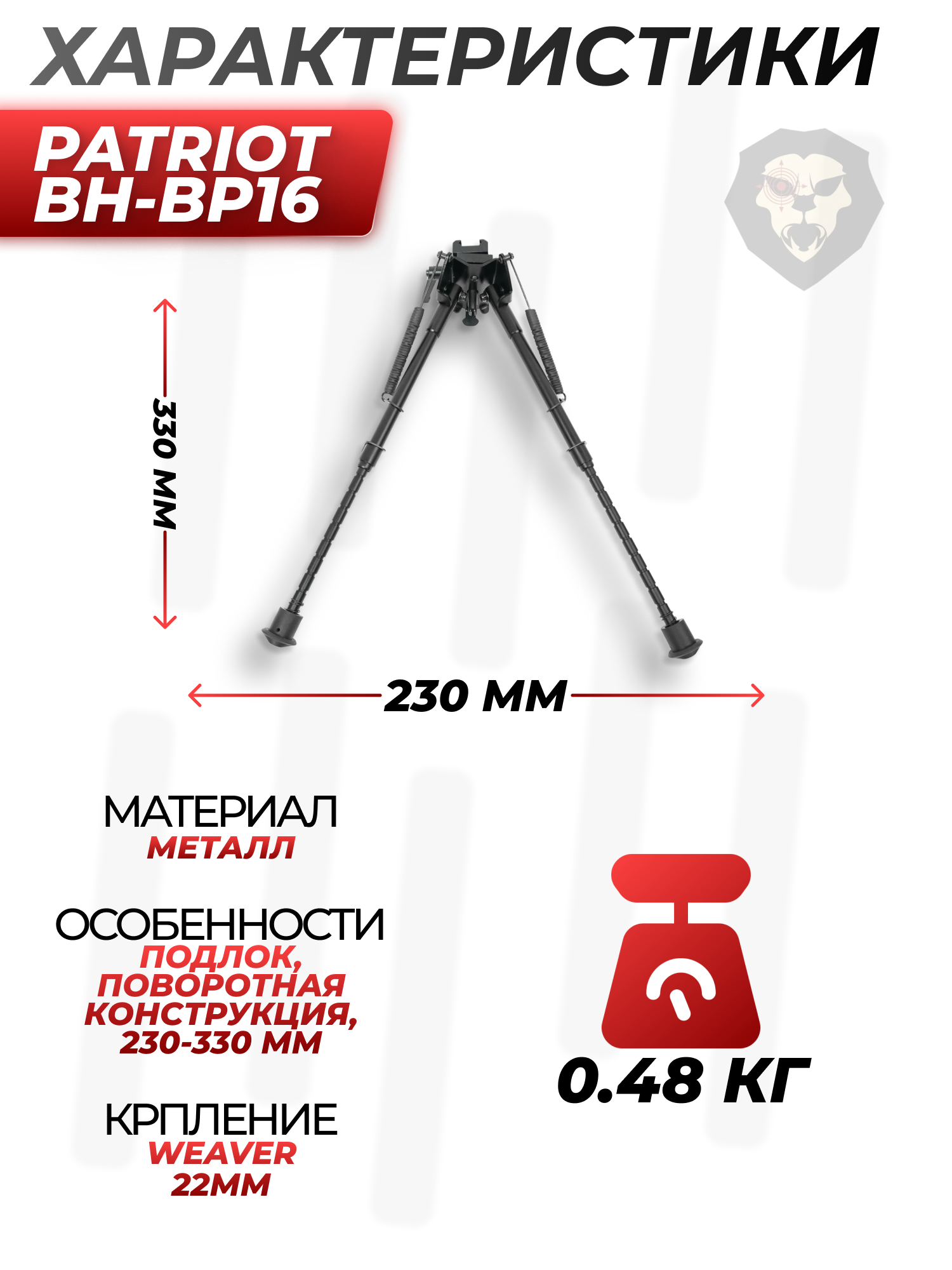 Артикул производителя BH-BP16 Сошки Patriot BH-BP16 (Weaver, подлок, 230-330 мм) по низкой цене 3790 руб. Модель со штрихкодом производителя Вы можете оплатить наложенным платежем с доставкой или в отделении транспортной компании (ПЭК, СДЭК, Boxberry). Ваш заказ со штрихкодом 2000000048840 забрать на почте с оплатой при получении в любой части Российской Федерации.
