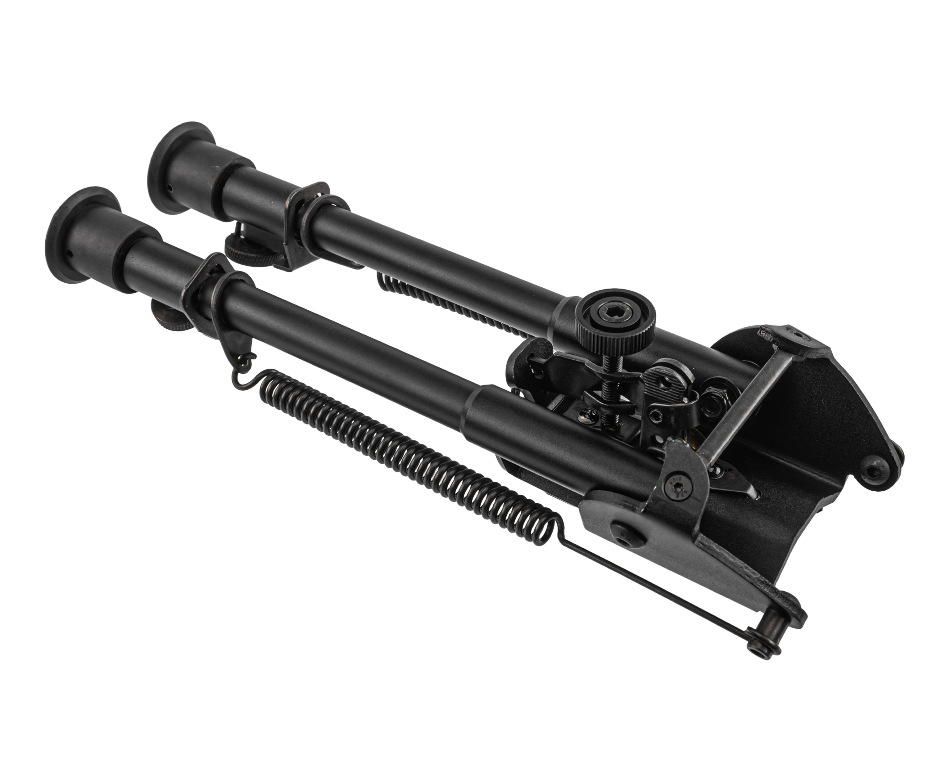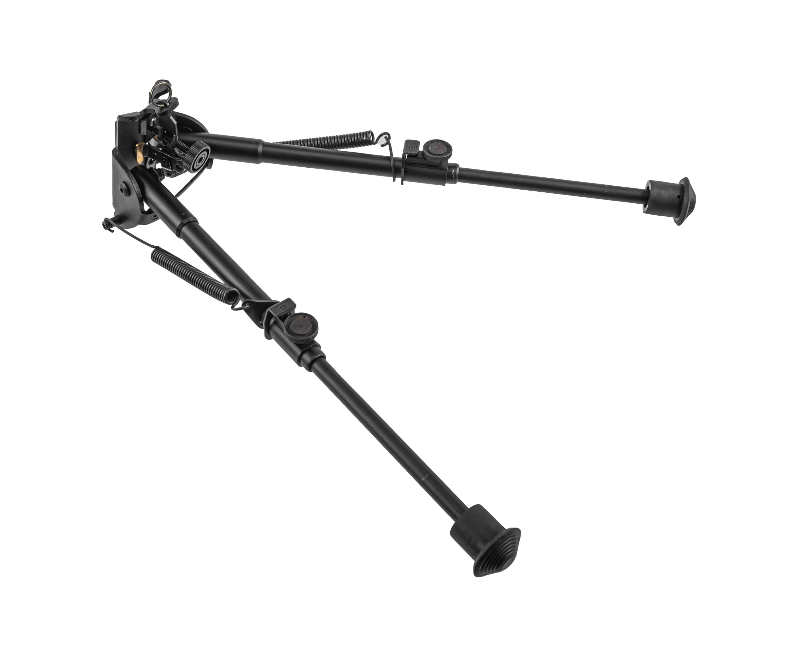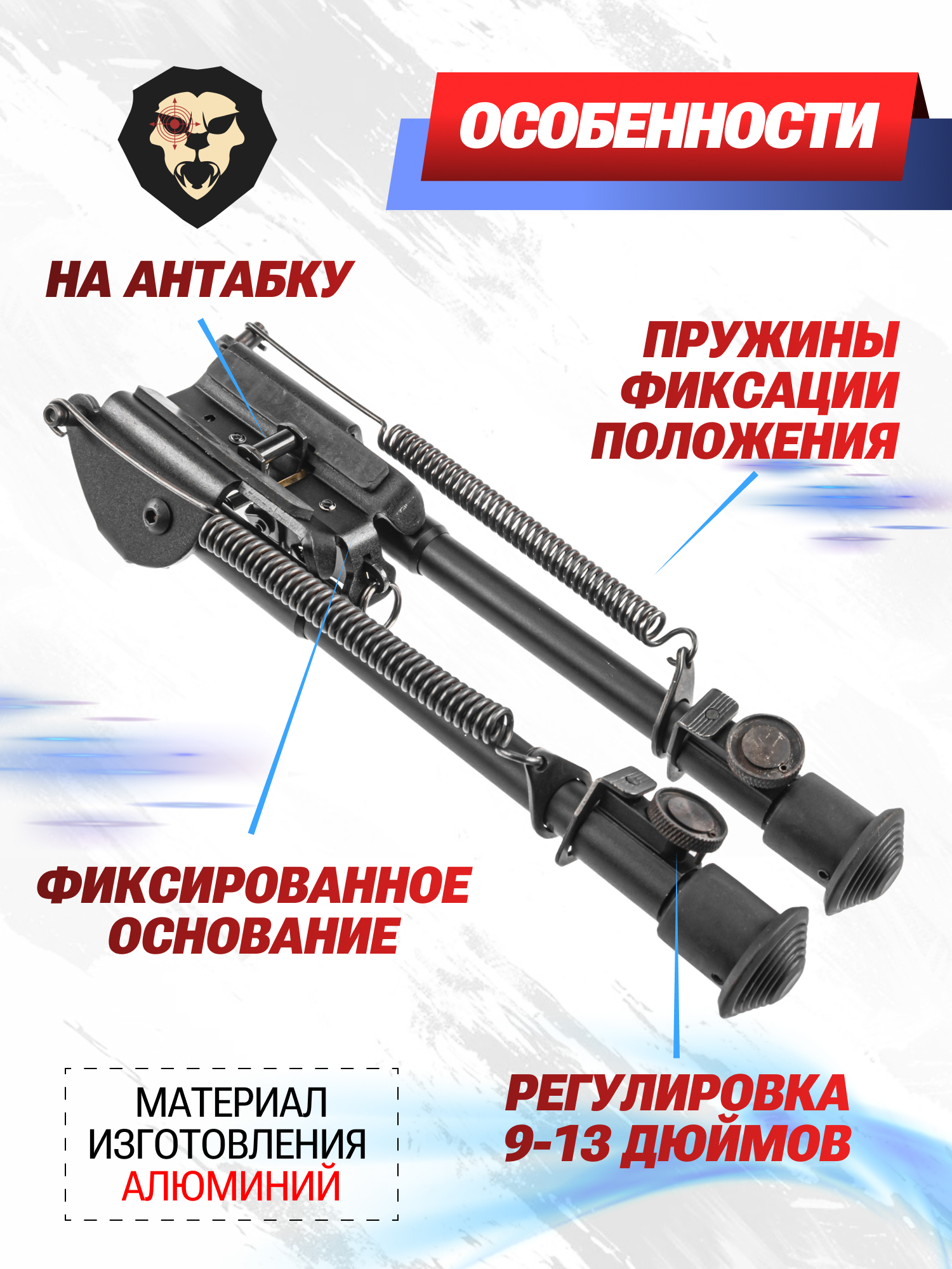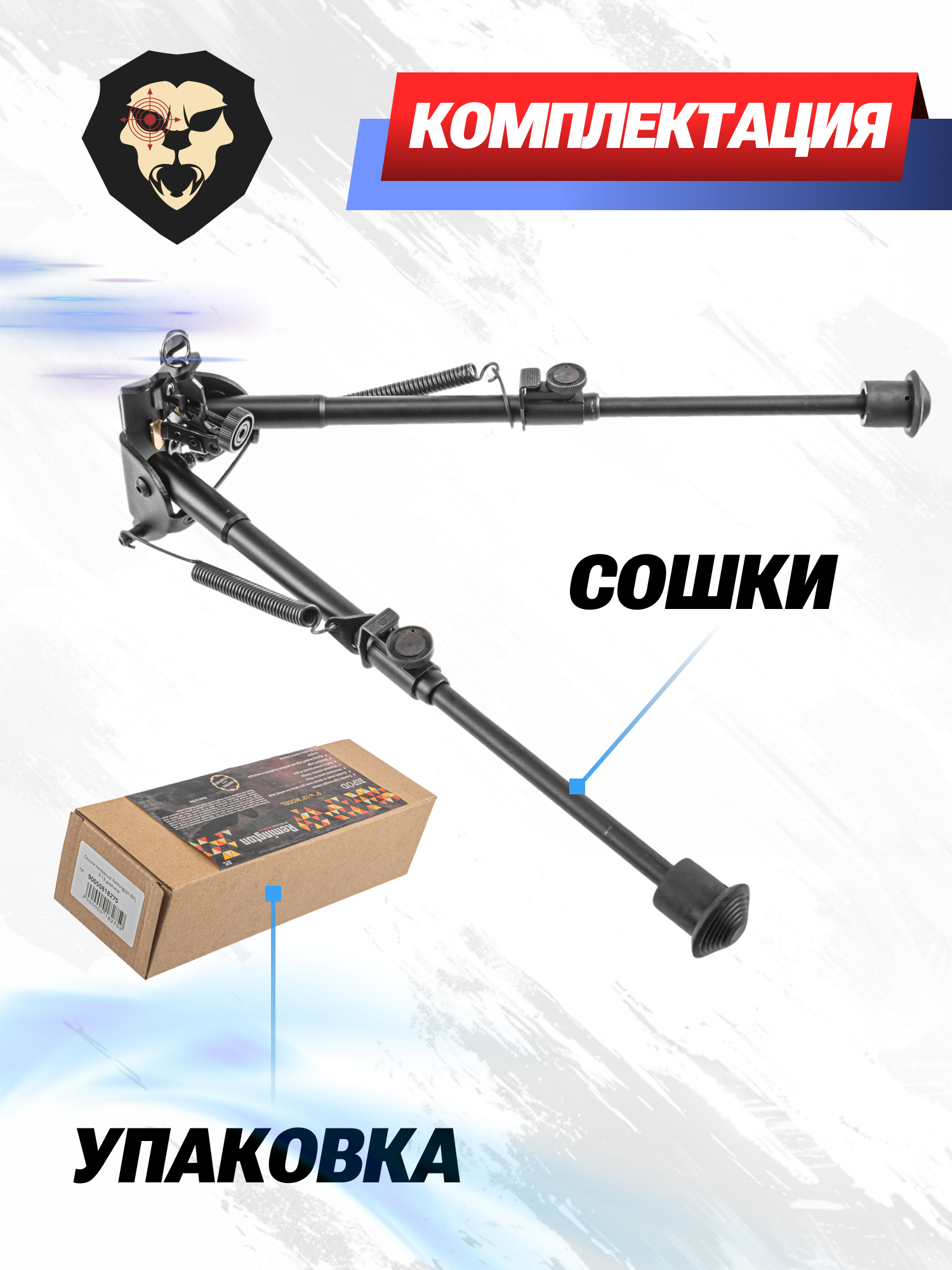Сошки на винтовку с телескопическими опорами 9-13 дюймов оперативно принимают рабочий вид - достаточно откинуть каждую ножку, зажав фиксатор в нижней части. Наконечники, в свою очередь, оформлены утолщенными накладками с ребристой поверхностью. С одной стороны они повышают устойчивость на неровной местности, а с другой - предотвращают скольжение при постановке на стрелковый стол или другую гладкую поверхность.