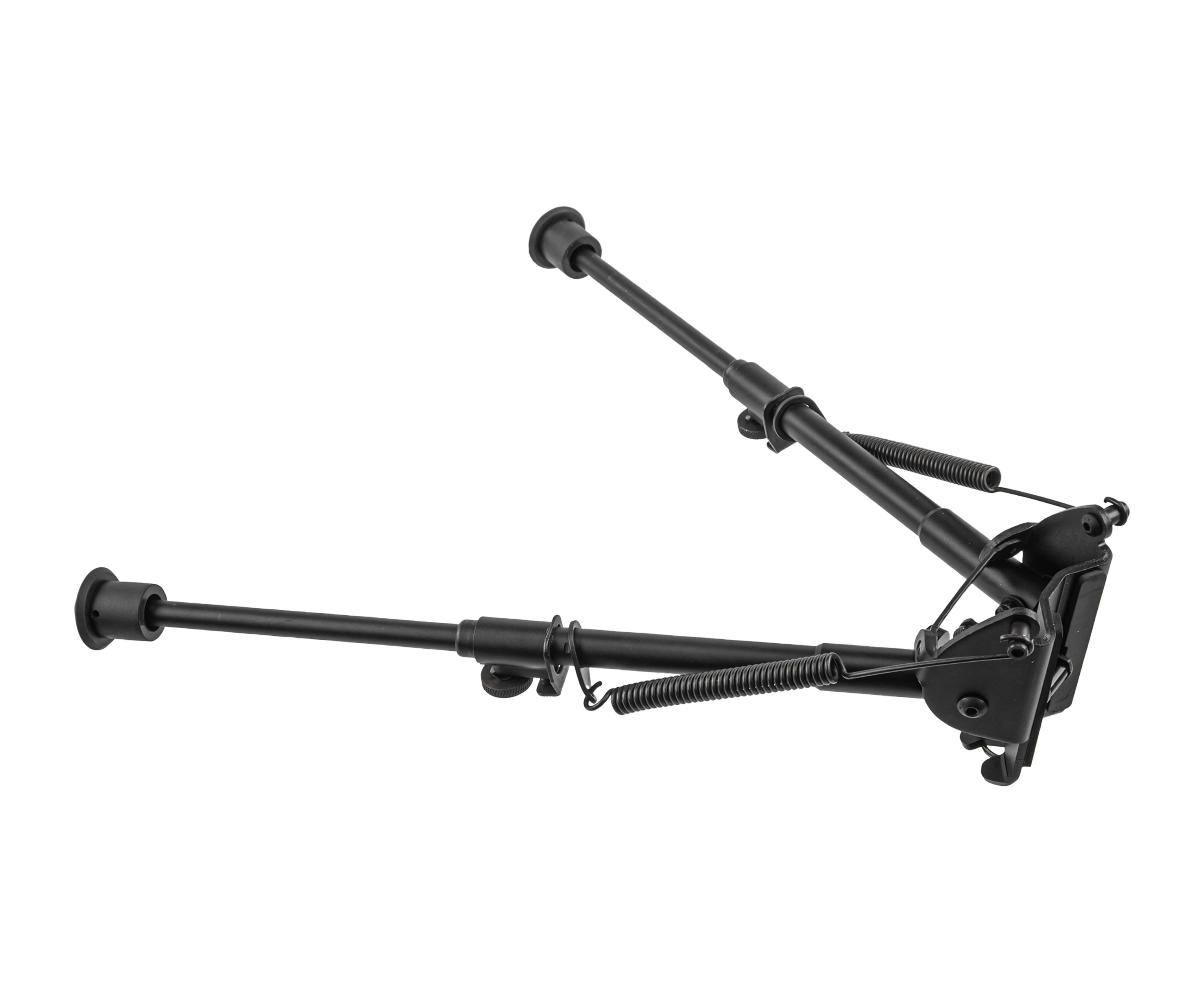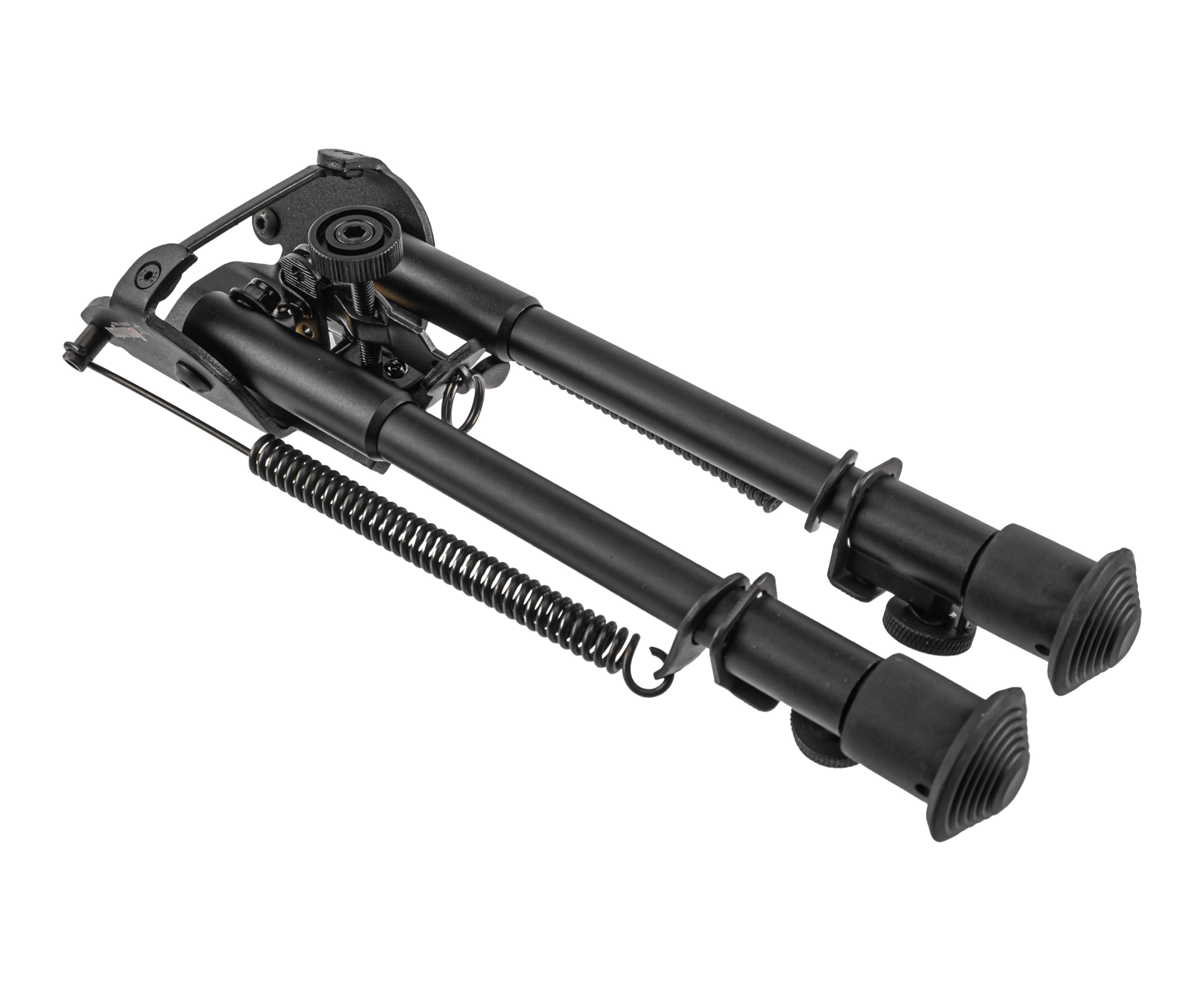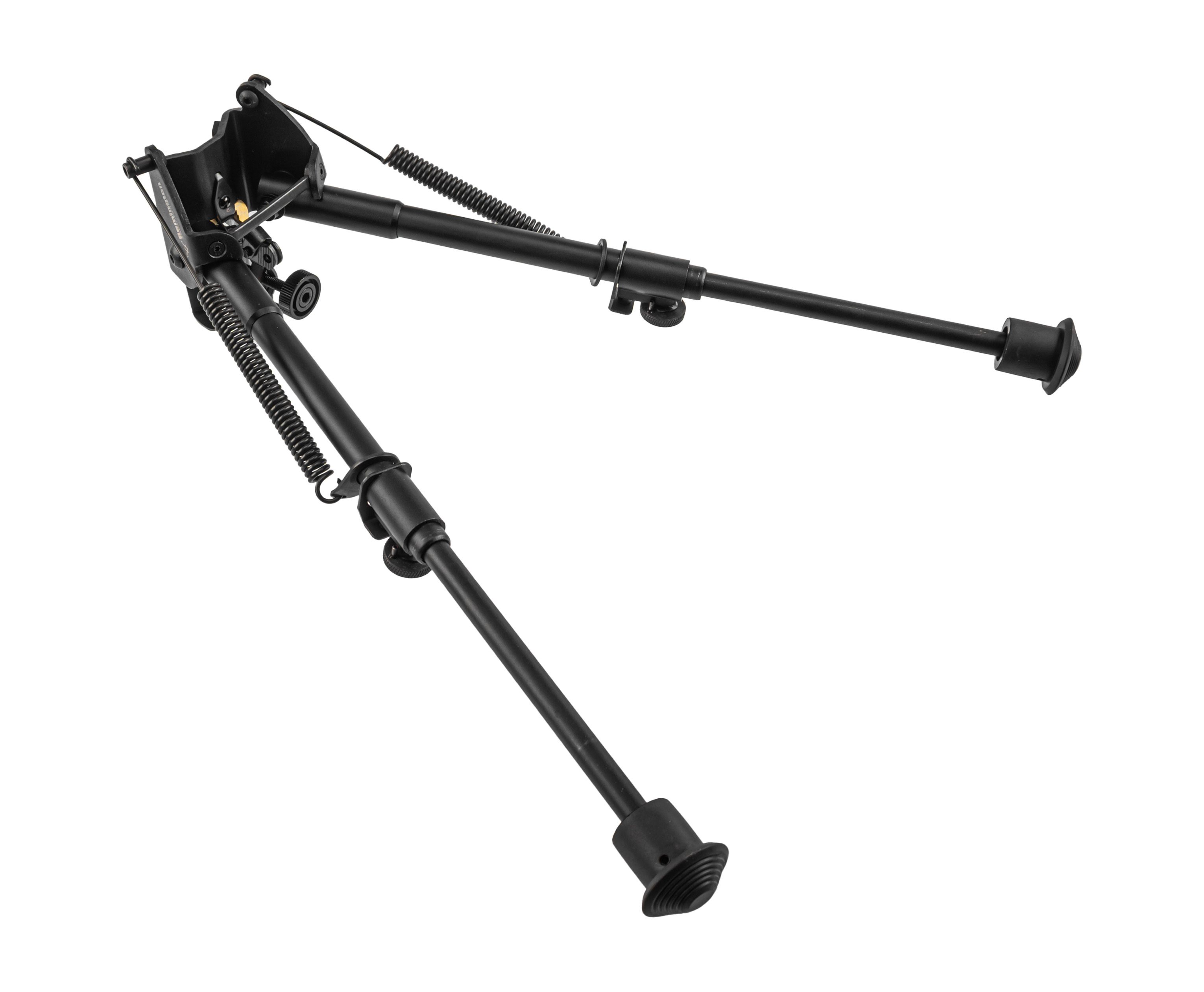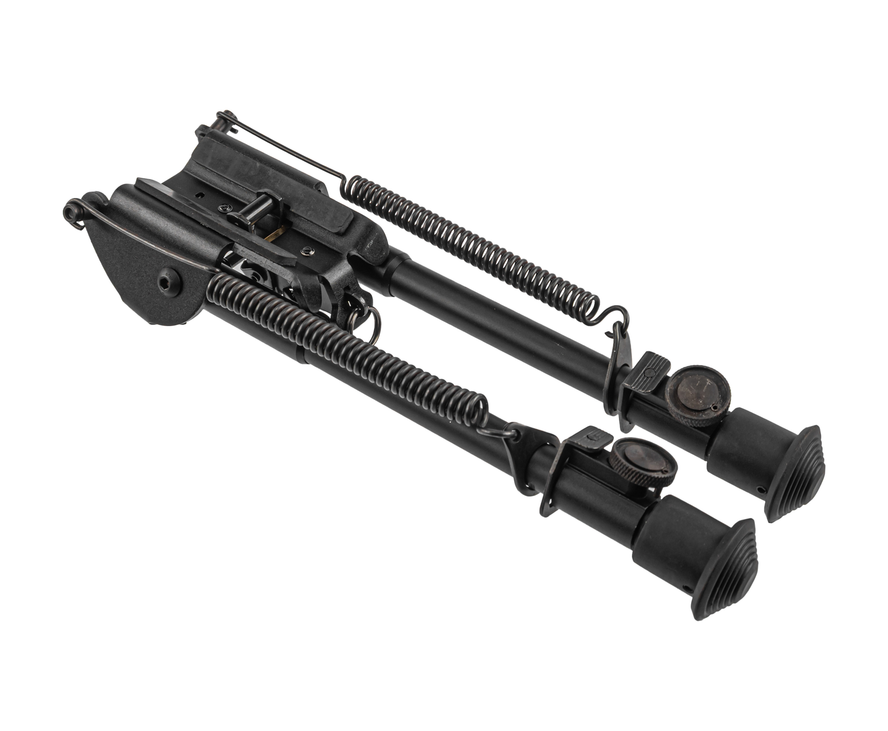 Сошки на винтовку с телескопическими опорами 9-13 дюймов оперативно принимают рабочий вид - достаточно откинуть каждую ножку, зажав фиксатор в нижней части. Наконечники, в свою очередь, оформлены утолщенными накладками с ребристой поверхностью. С одной стороны они повышают устойчивость на неровной местности, а с другой - предотвращают скольжение при постановке на стрелковый стол или другую гладкую поверхность.