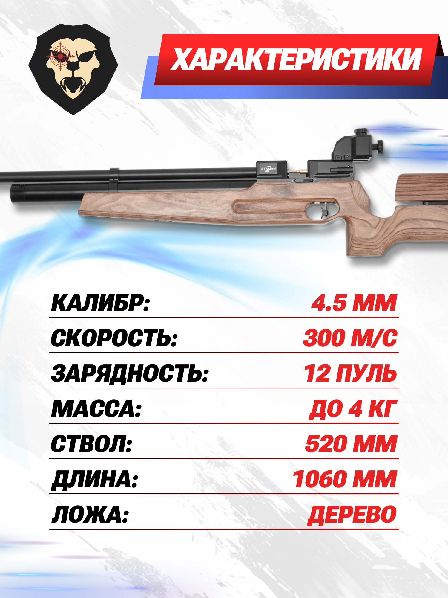 Обозреваемая биатлонная винтовка Ataman не отстает от огнестрельных спортивных снарядов в вопросе точности и дальности - оружие разгоняет пулю 177 калибра до 300 метров в секунду, чего хватает для поражения силуэтных мишеней и кругов внутри установки. При этом указано, что представленный образец ограничен мощностью 3 Джоуля по требованию законодательства.
