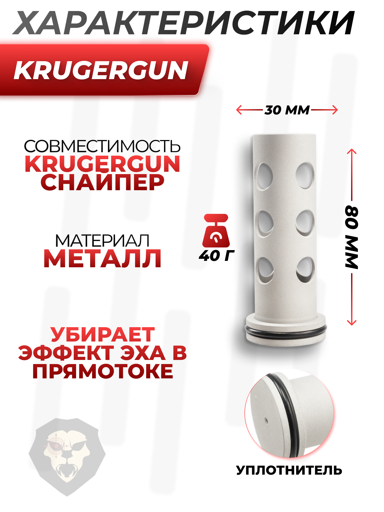 Модель подходит к Krugergun Снайпер в классическом исполнении и буллпап, настроенных на прямоток. Деталь требуется установить со стороны резьбы ресивера, так, чтобы часть с резиновым кольцом была в направлении внутрь.