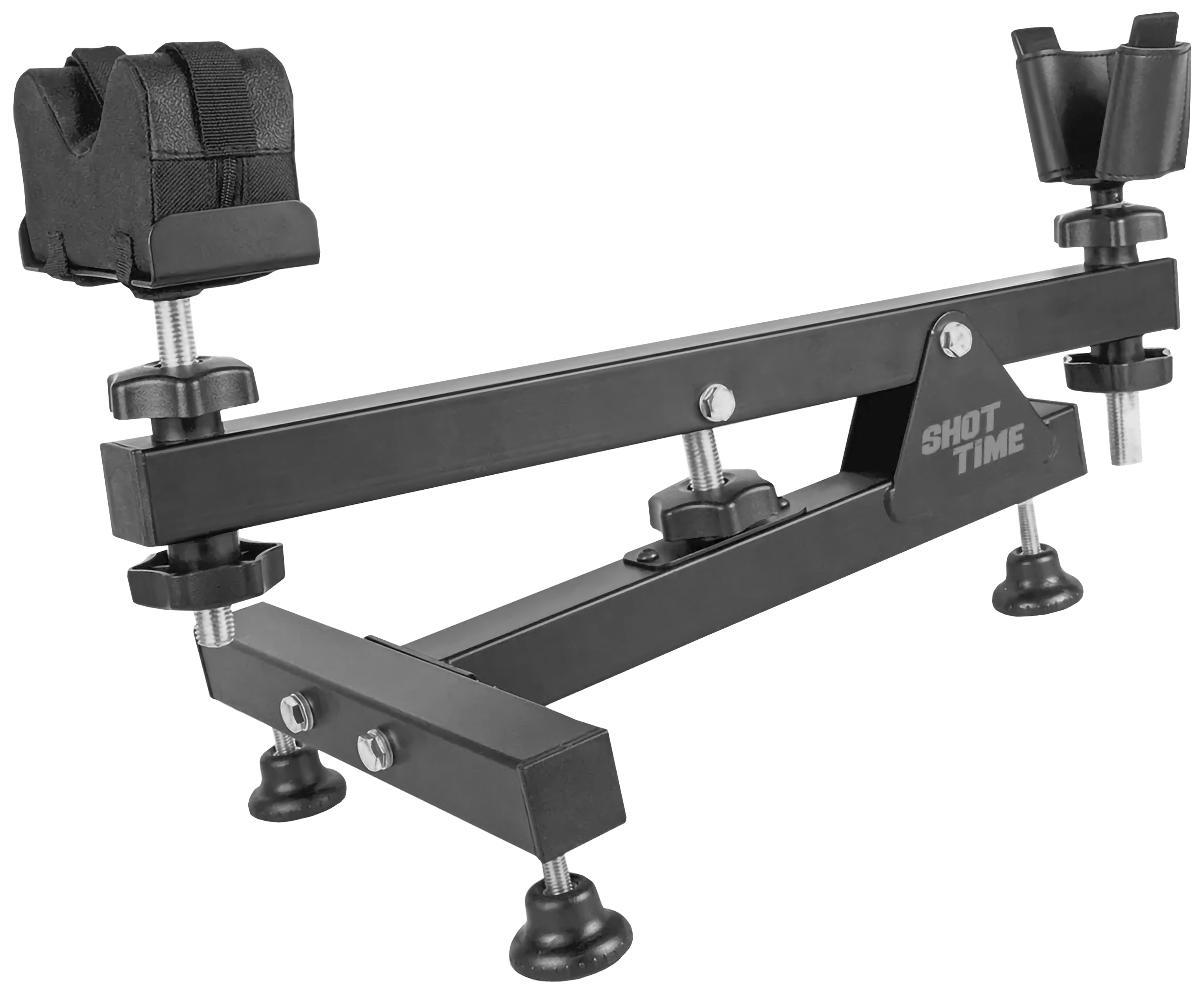 По мере необходимости станок ШотТайм выставляется по высоте и углу наклона посредством изменения положения полимерных ножек - для лучшей устойчивости их подошва утолщена. В свою очередь оружие фиксируется при помощи кожаного упора приклада и подушки под цевье из синтетической ткани. Мягкий ложемент не допускает повреждения деталей винтовки при выстреле.