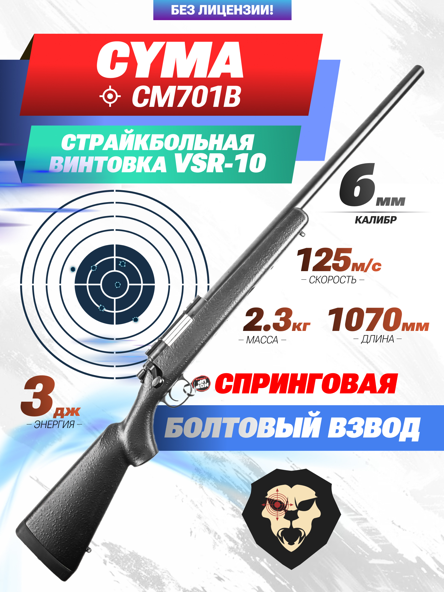 Винтовка Cyma VSR 10 предназначена для страйкбольных игр и развлекательной стрельбы. Дульная энергия образца находится в рамках разрешенного диапазона до 3 Дж, то есть модель приобретается свободно по достижении возраста восемнадцати лет без потребности в оформлении лицензии.
