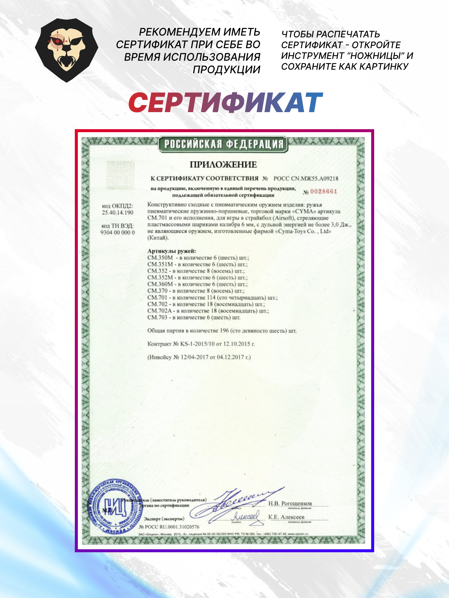 Информация о товаре "Страйкбольная винтовка Cyma CM701B VSR-10 (6 мм, спринг, RIS-планка)" носит ознакомительный характер, и не является публичной офертой, определяемой положениями Статьи 437 Гражданского кодекса Российской Федерации, характеристики, внешний вид, цвет и комплектация могут быть изменены производителем без уведомления.