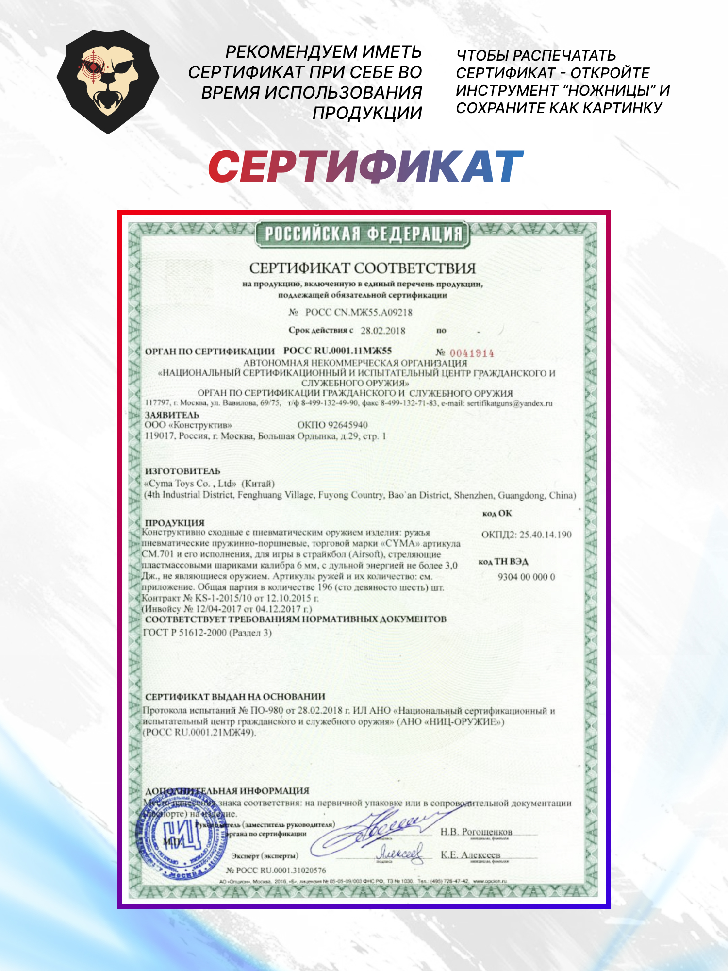 | Комплектация | Винтовка, магазин, лоадер, упаковка, краткая документация, копия сертификата (по запросу покупателя) |