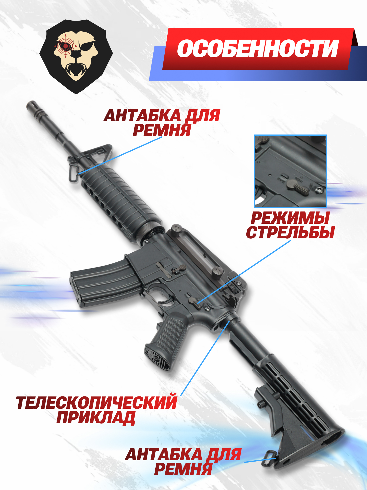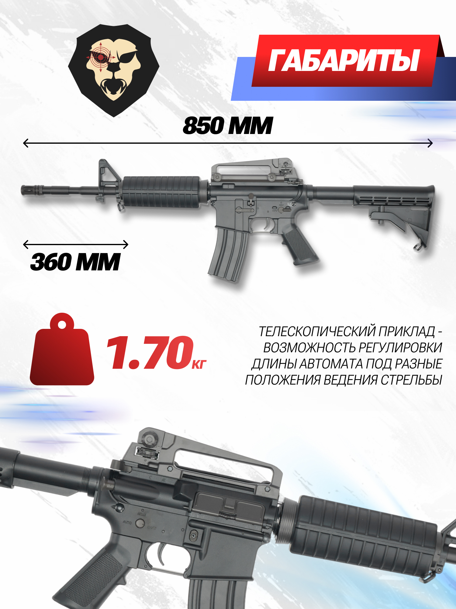 Отличительной особенностью оригинала, которую успешно скопировала страйкбольная версия, является телескопический приклад. Упор обладает пятью позициями и позволяет регулировать длину винтовки от 77 до 85 см. Для этого необходимо утопить фиксатор на нижней стороне и выставить желаемую позицию приклада.