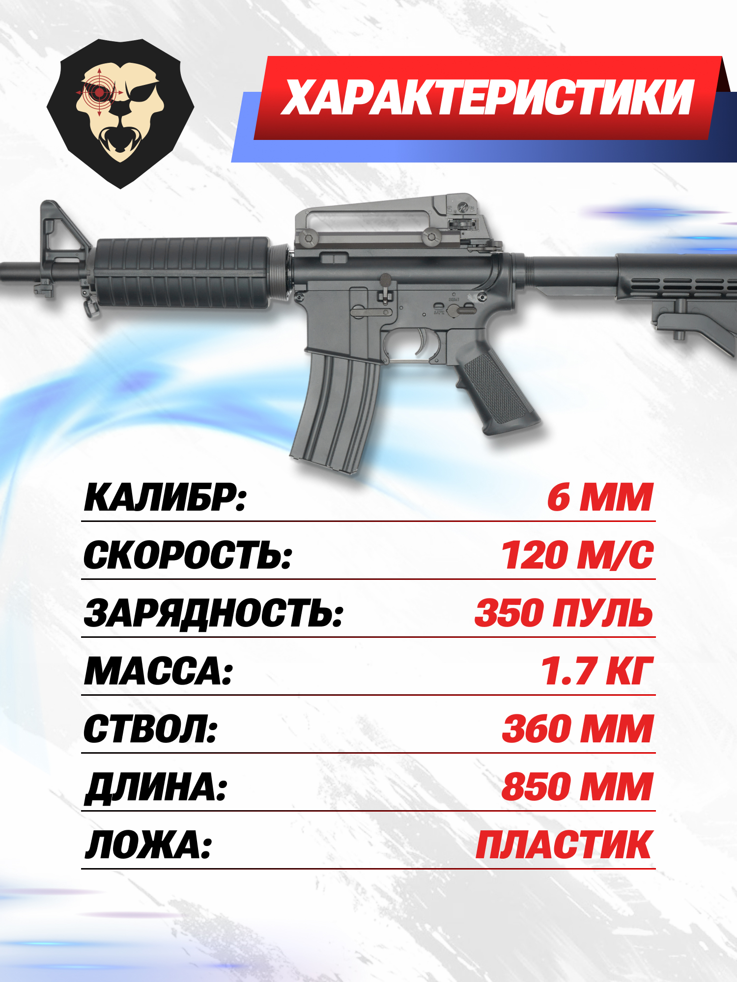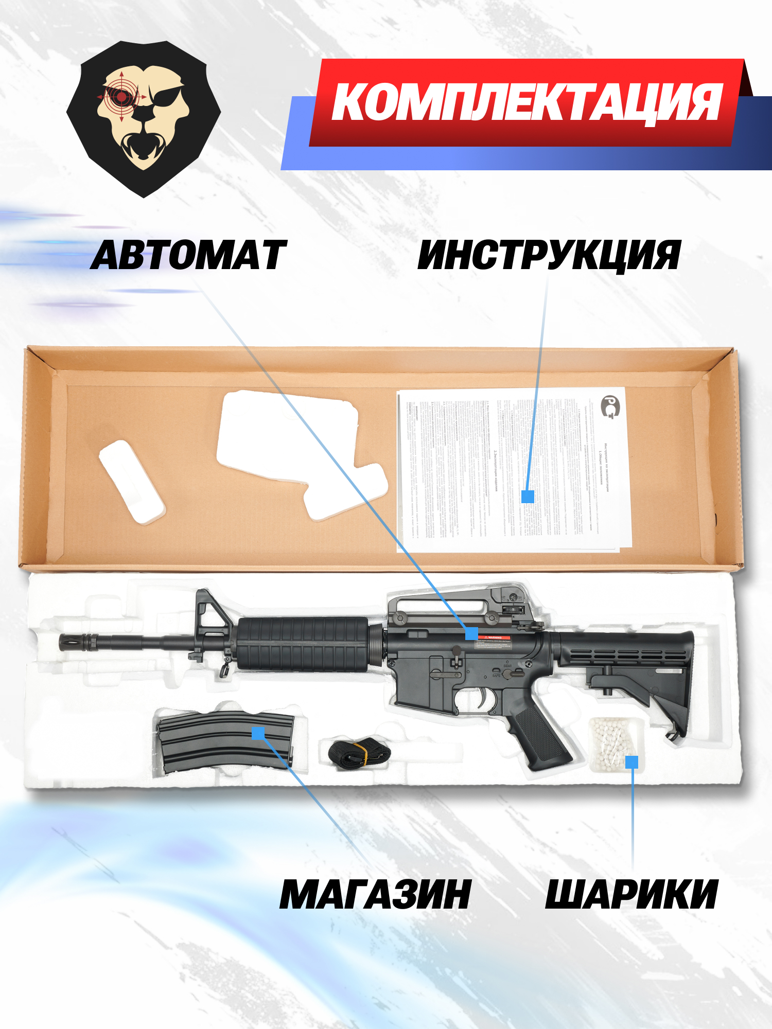 | Комплектация | Автомат, магазин, аккумулятор, зарядное устройство, шарики, шомпол, инструкция, упаковка |