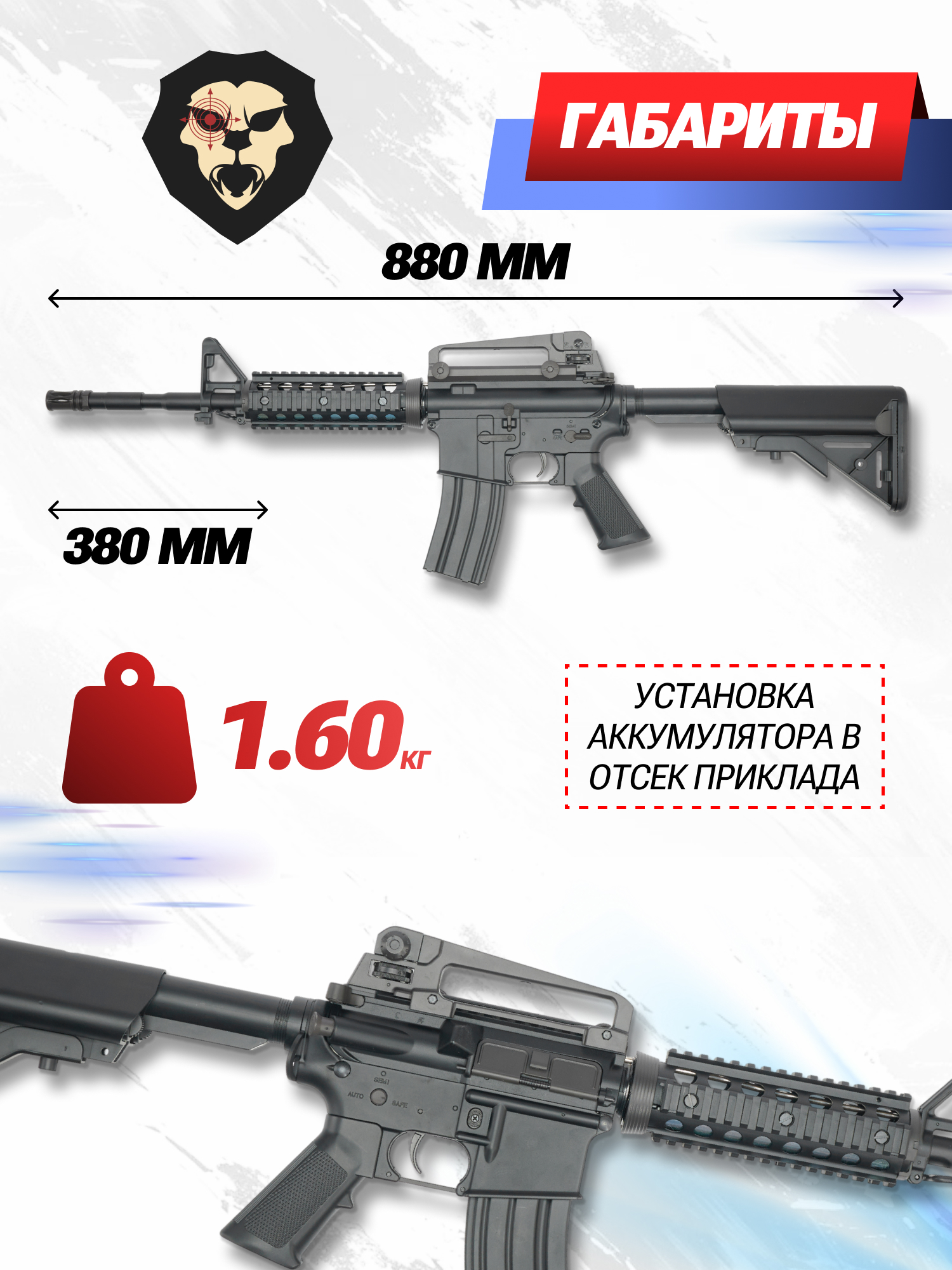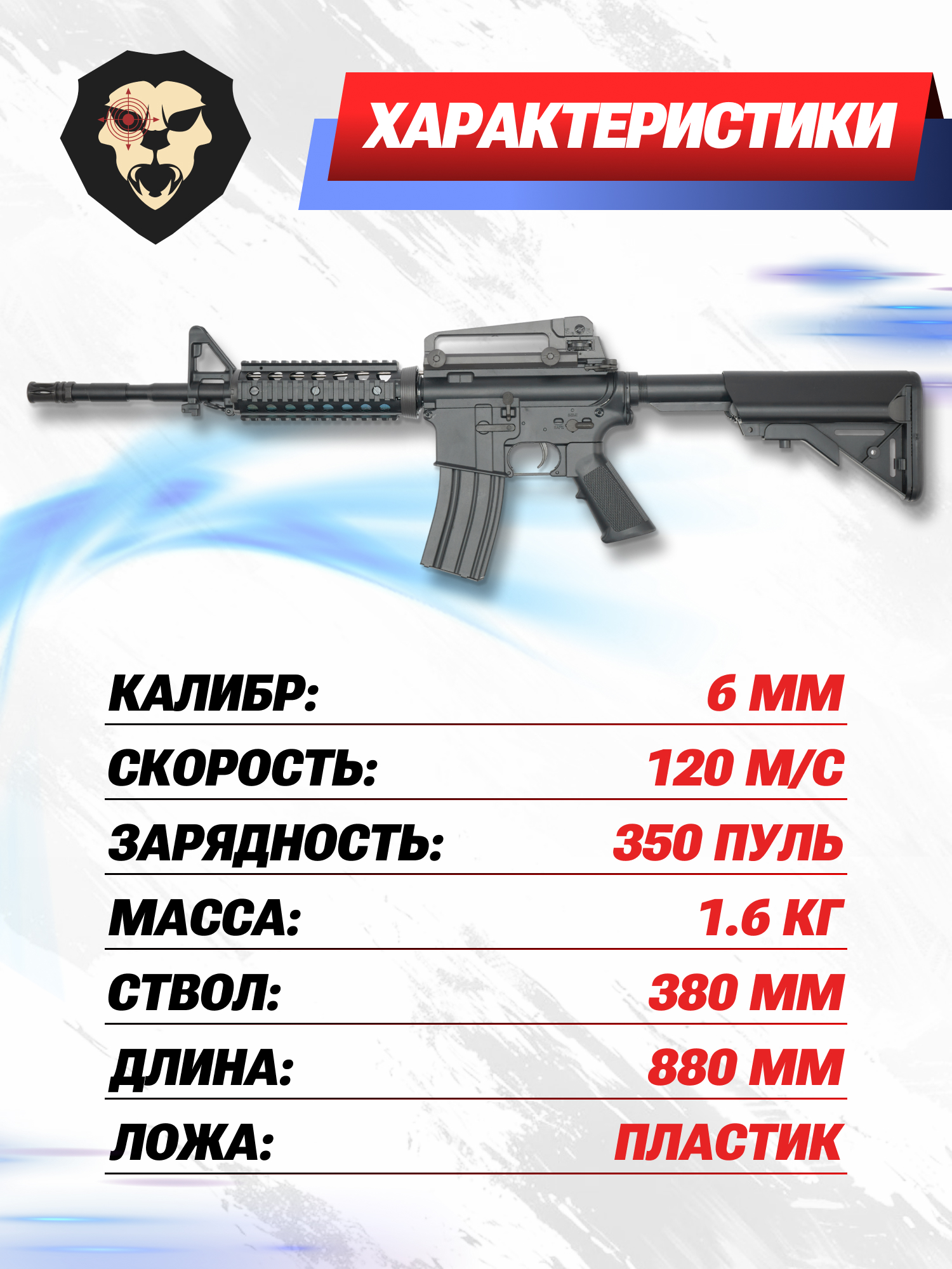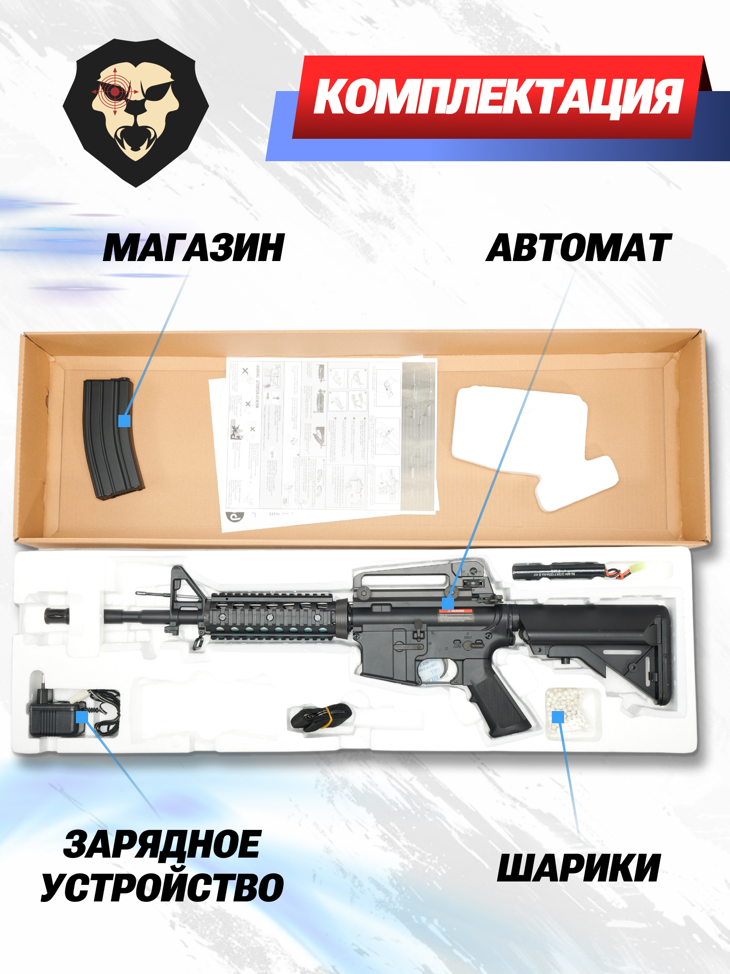 | Комплектация | Автомат, магазин, аккумулятор, зарядное устройство, шарики, шомпол, инструкция |