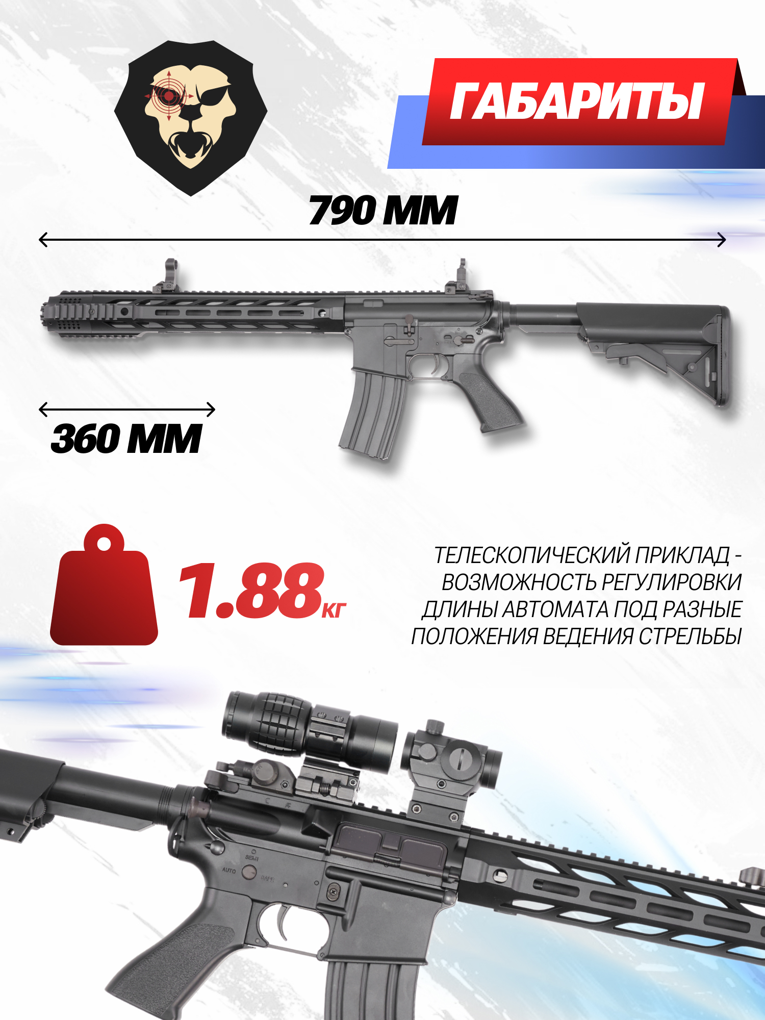 Общий габарит привода составляет 79 сантиметров. Модель оснащается телескопическим прикладом - настройка его длины осуществляется путем зажатия кнопки фиксатора в нижней части. Сам плечевой упор служит коробом для аккумулятора - подключение последнего выполняется кабелем с разъемом mini-Tamiya.