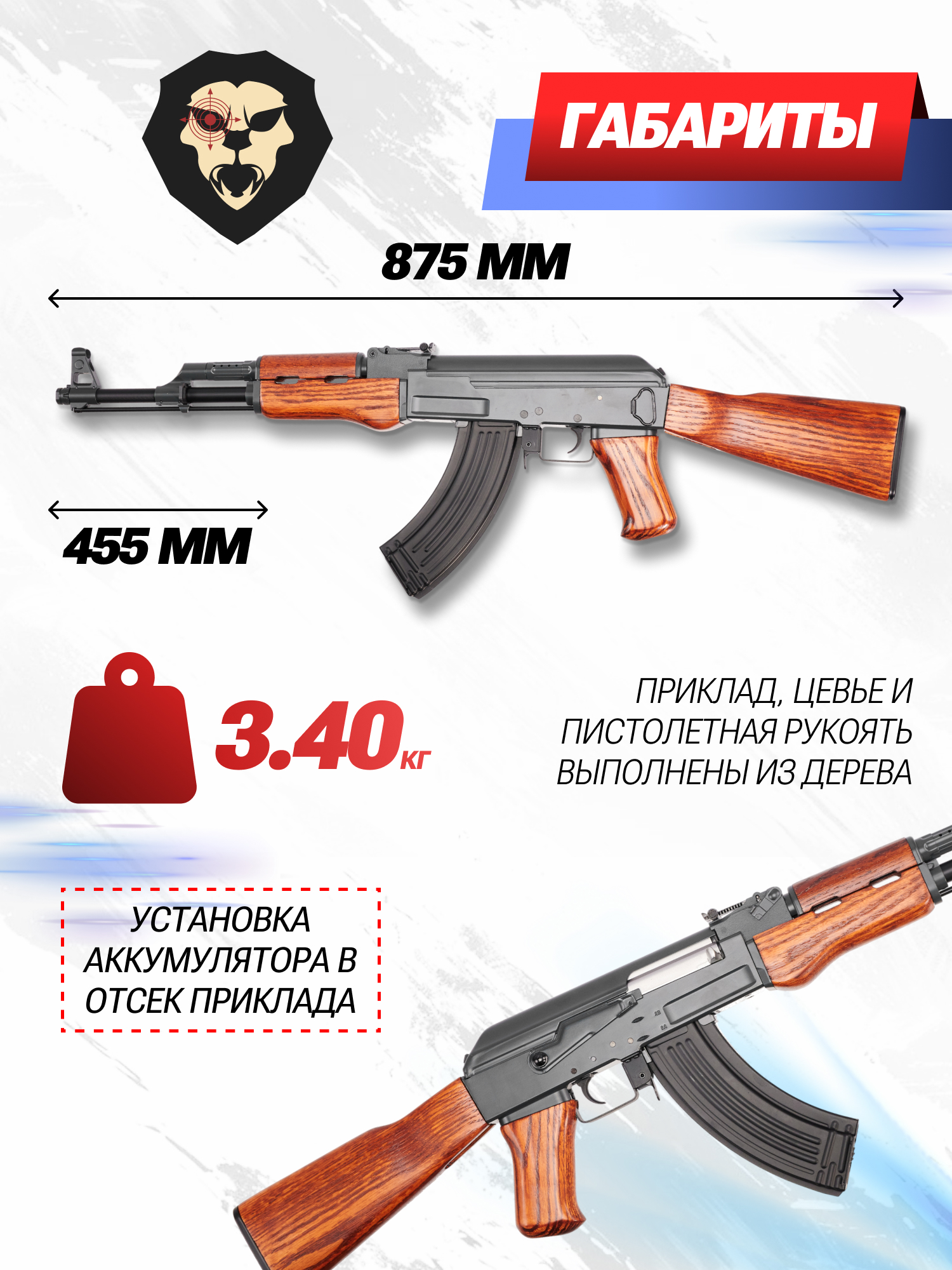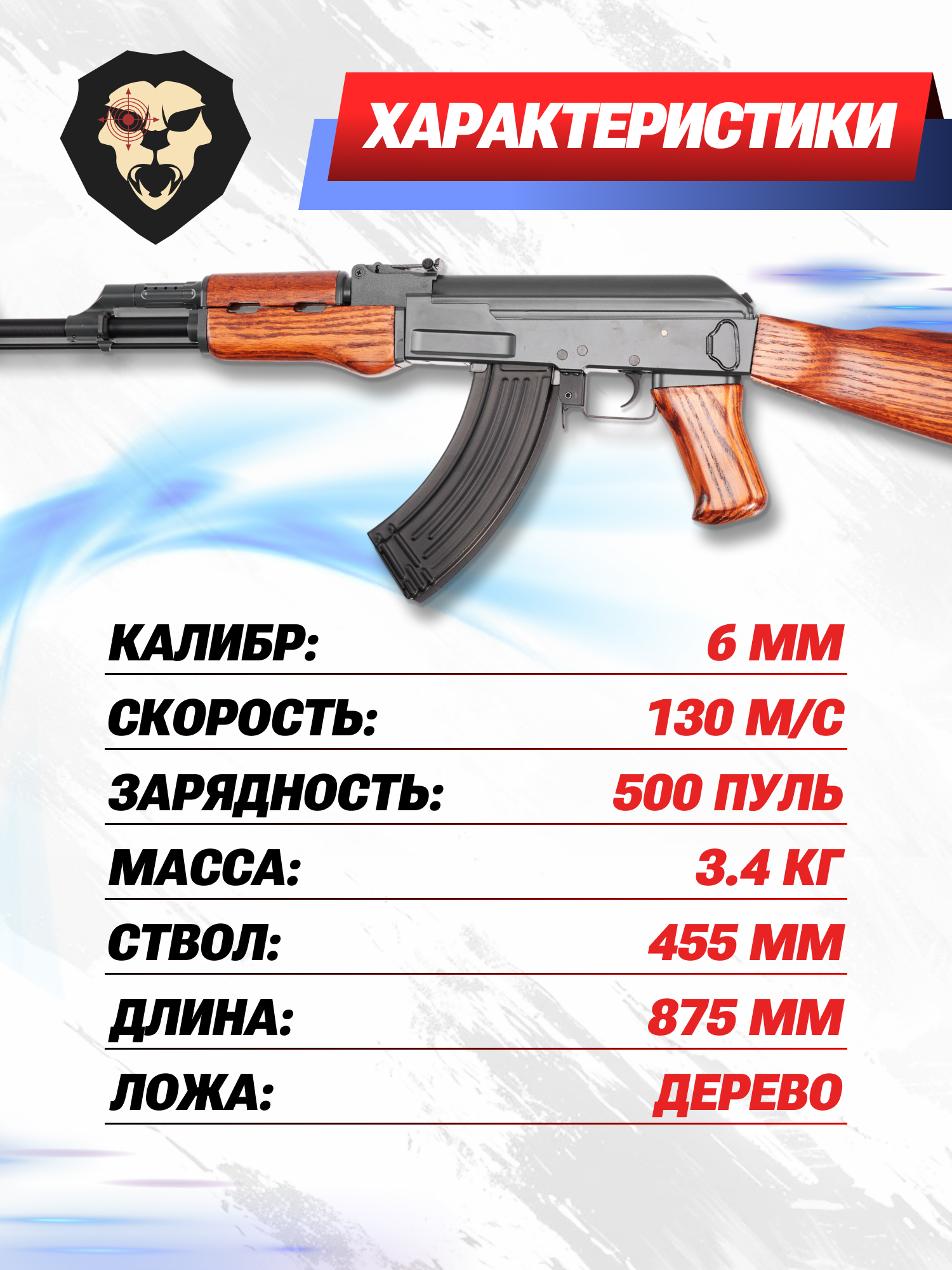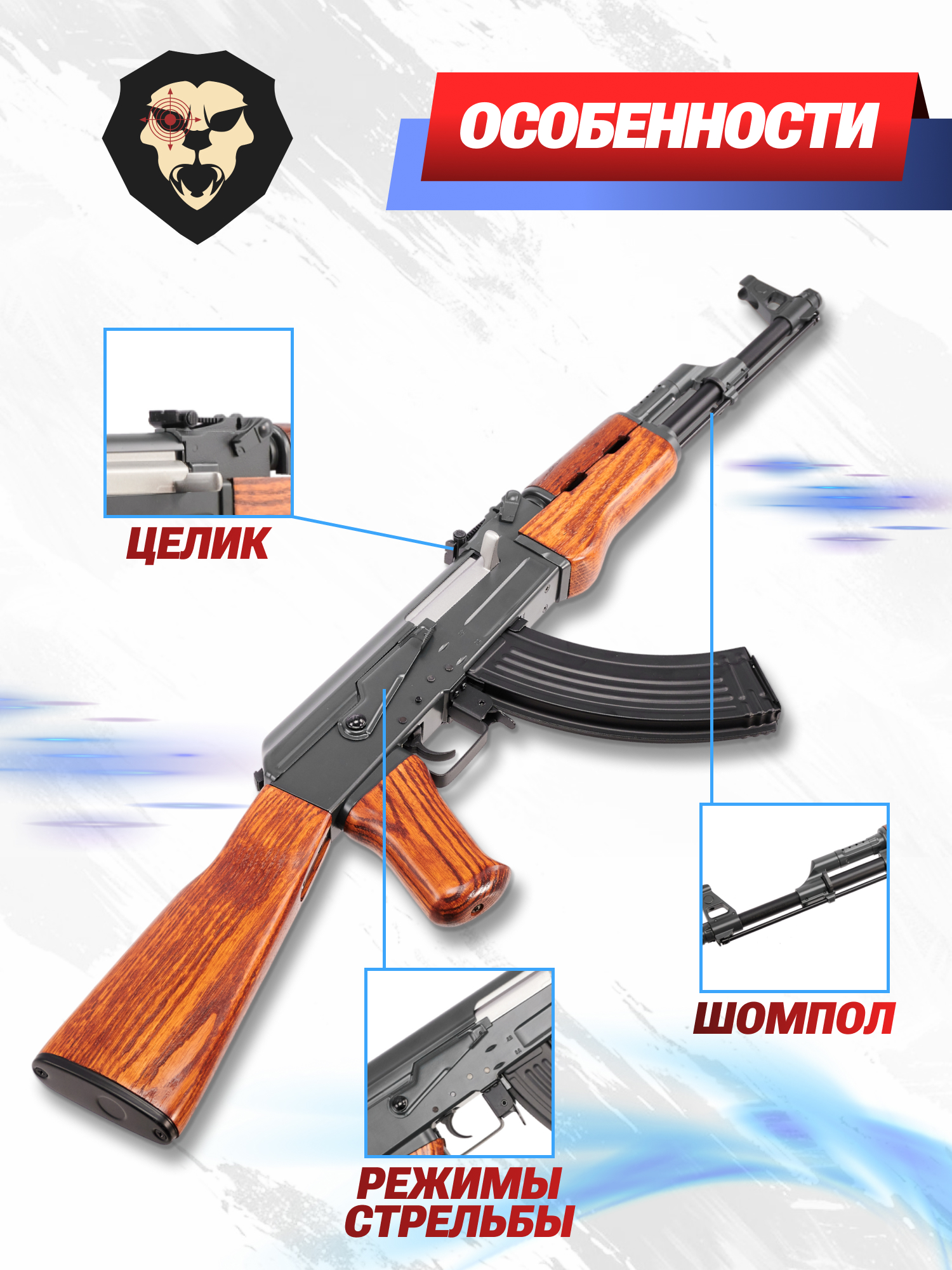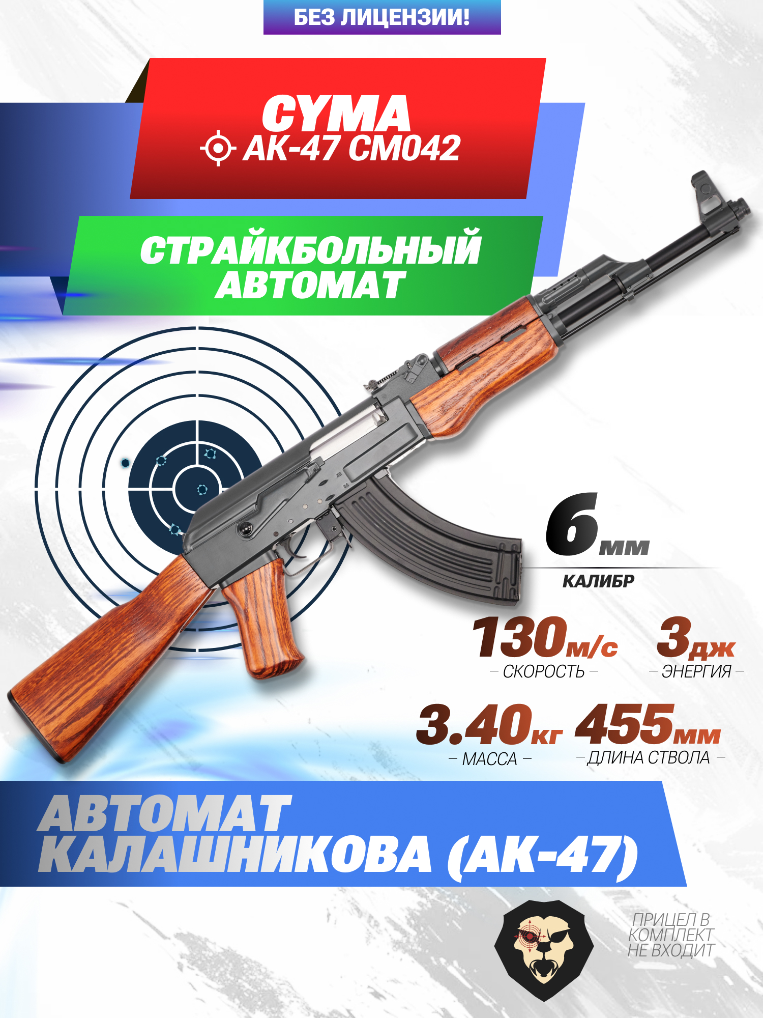 Информация о товаре "Страйкбольный автомат Cyma АК-47 CM042 (6 мм, дерево, Калашников)" носит ознакомительный характер, и не является публичной офертой, определяемой положениями Статьи 437 Гражданского кодекса Российской Федерации, характеристики, внешний вид, цвет и комплектация могут быть изменены производителем без уведомления.