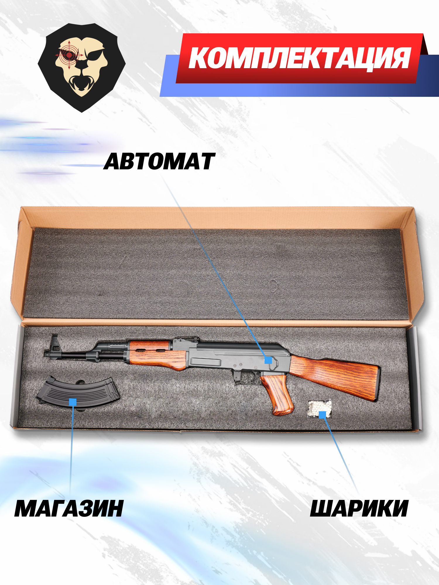 | Комплектация | Автомат, магазин, шарики, шомпол, инструкция, упаковка |
