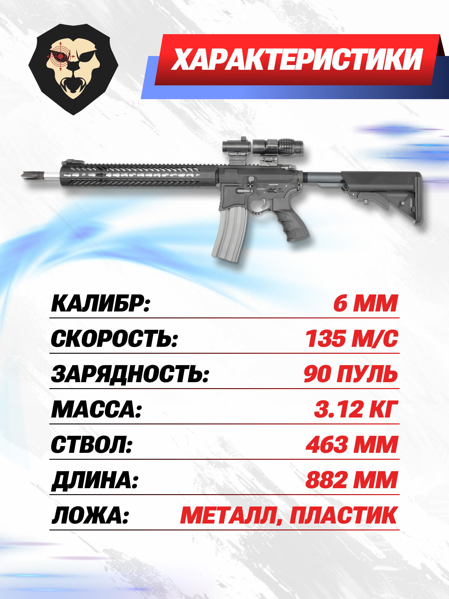 Технические характеристики страйкбольной штурмовой винтовки дает при выстреле разгонять пластиковые снаряды массой от четверти грамма до скорости выше 135 метров в секунду. При описанной мощности, а также за счет наличия регулируемого узла Hop-Up, представленный привод демонстрирует требуемую эффективность не только при стрельбе на малой дистанции.