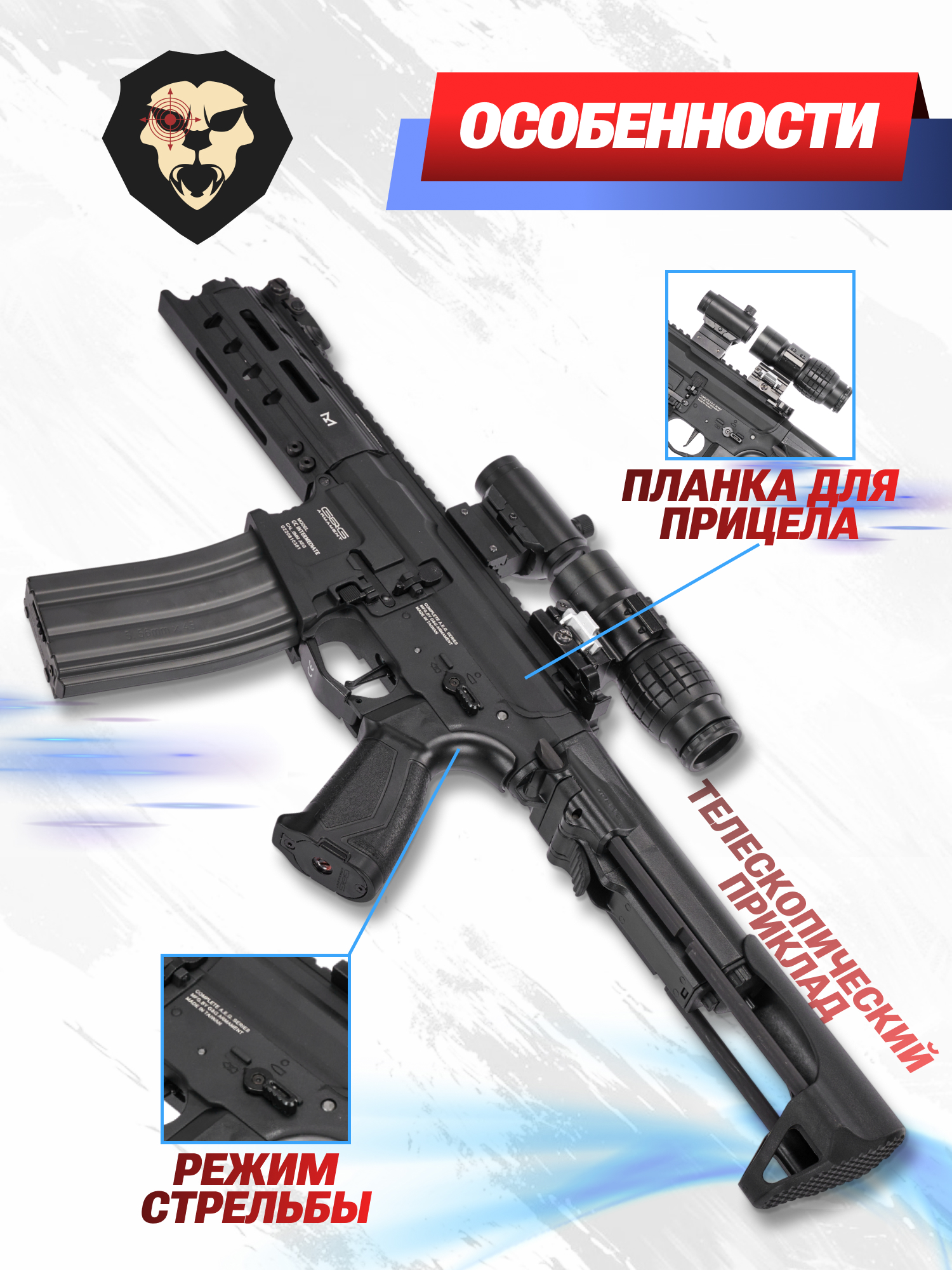Страйкбольный автомат AEG от ГиГ Армамент функционирует в полуавтоматическом и автоматическом режиме. Трехпозиционный селектор находится с левой стороны ресивера и также отвечает за постановку на предохранитель. Электронный ключ делает спуск более отзывчивым и позволяет активировать функцию отсечки по 3 шара - для этого переводчик огня ставится в положение semi-auto, и спуск зажимается на 10 секунд.