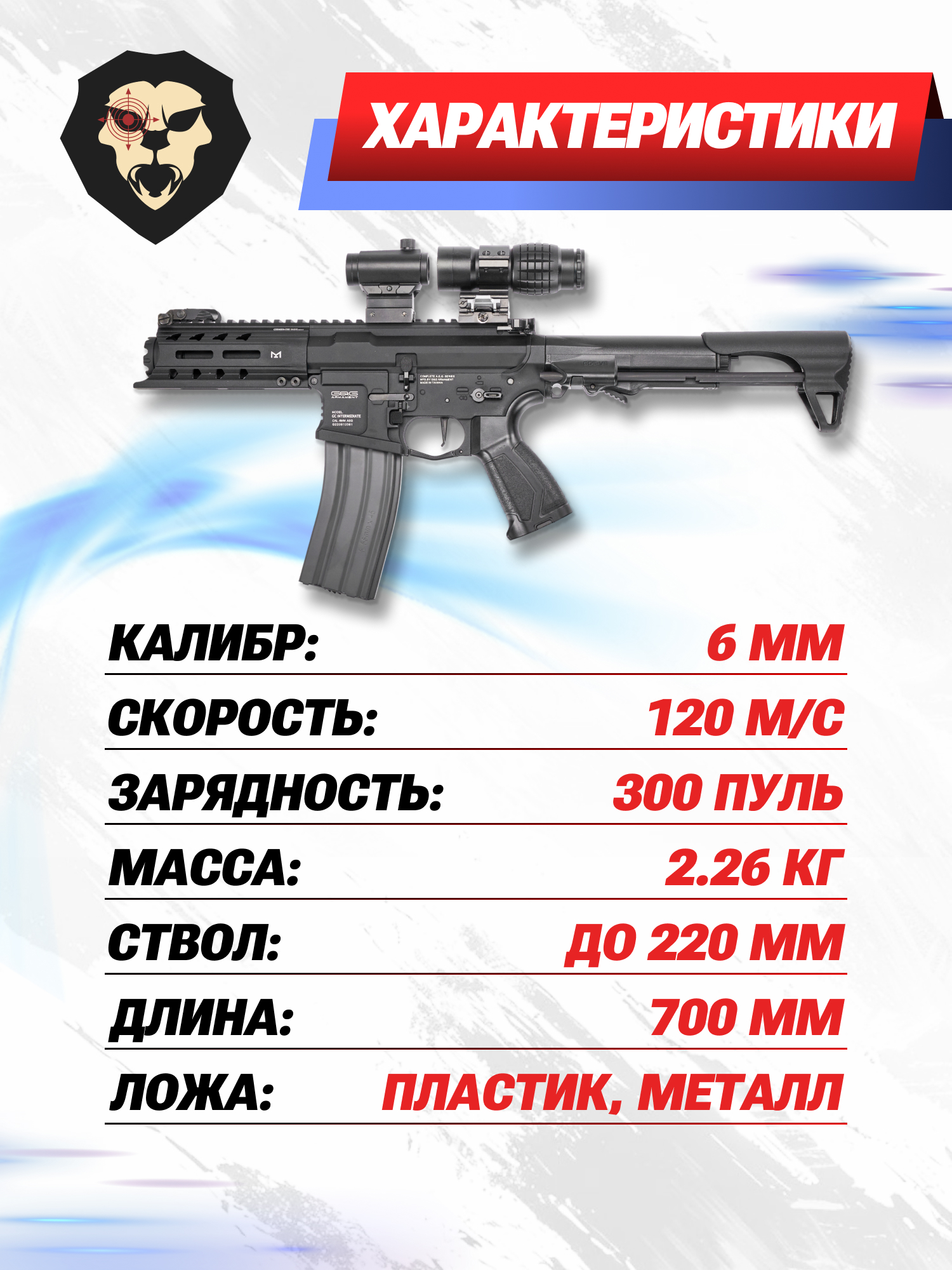| Комплектация | Страйкбольный автомат, магазин, упаковка, краткая документация, копия сертификата (по запросу покупателя) |