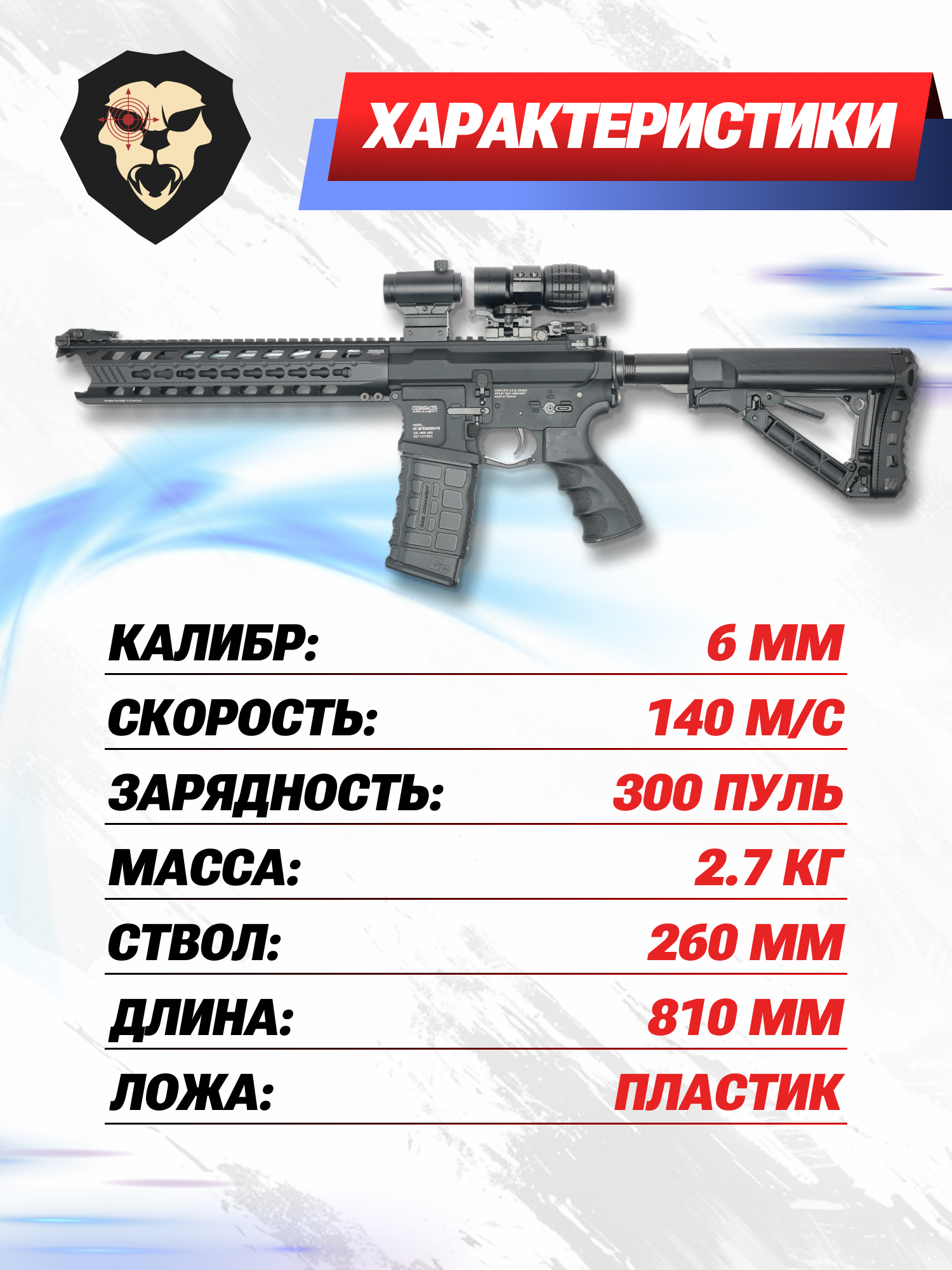 Представленное оружие относится к классу Air Electric Gun. Внутри привода установлен Гирбокс в.2, приводимый в действие электромотором. Представленная конструкция разгоняет 6 миллиметровый шар до 140 метров в секунду.
