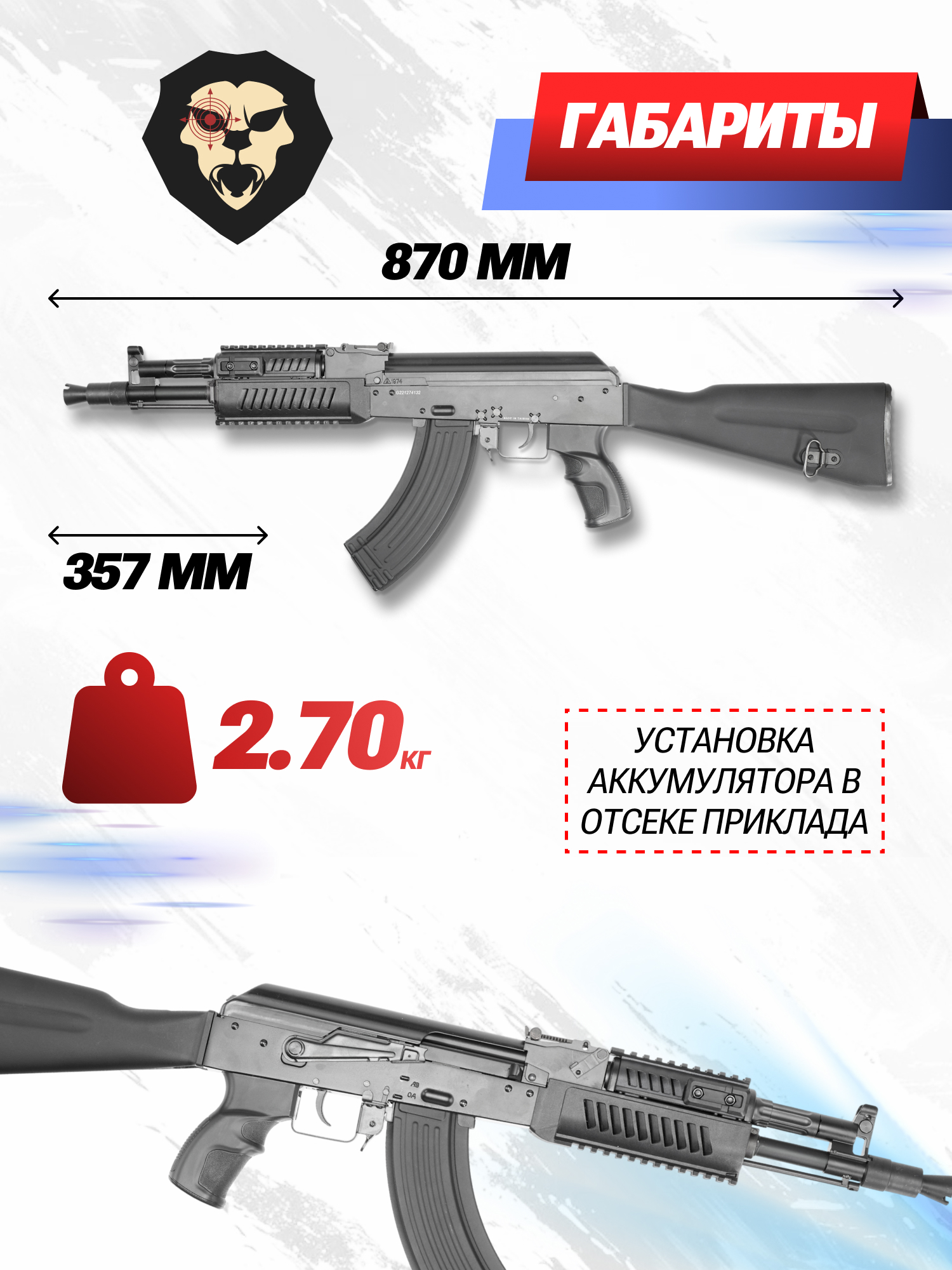 Модель АК-104 характеризуется размером 870 мм и оснащается фиксированным полимерным прикладом - при желании устанавливается переходник с телескопической трубой под тактические современные плечевые упоры. Во внутренней полости размещаются энергоносители формата Li-Po на 1200 мАч, подключаемые через разъем Tamiya. Для доступа к влагозащищенному отсеку приклада потребуется демонтировать затыльник, используя крестовую отвертку.
