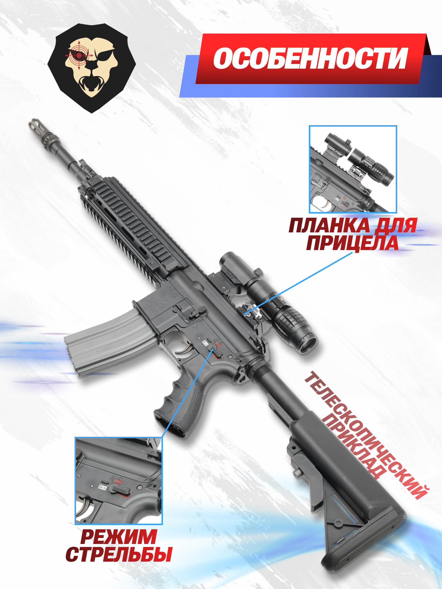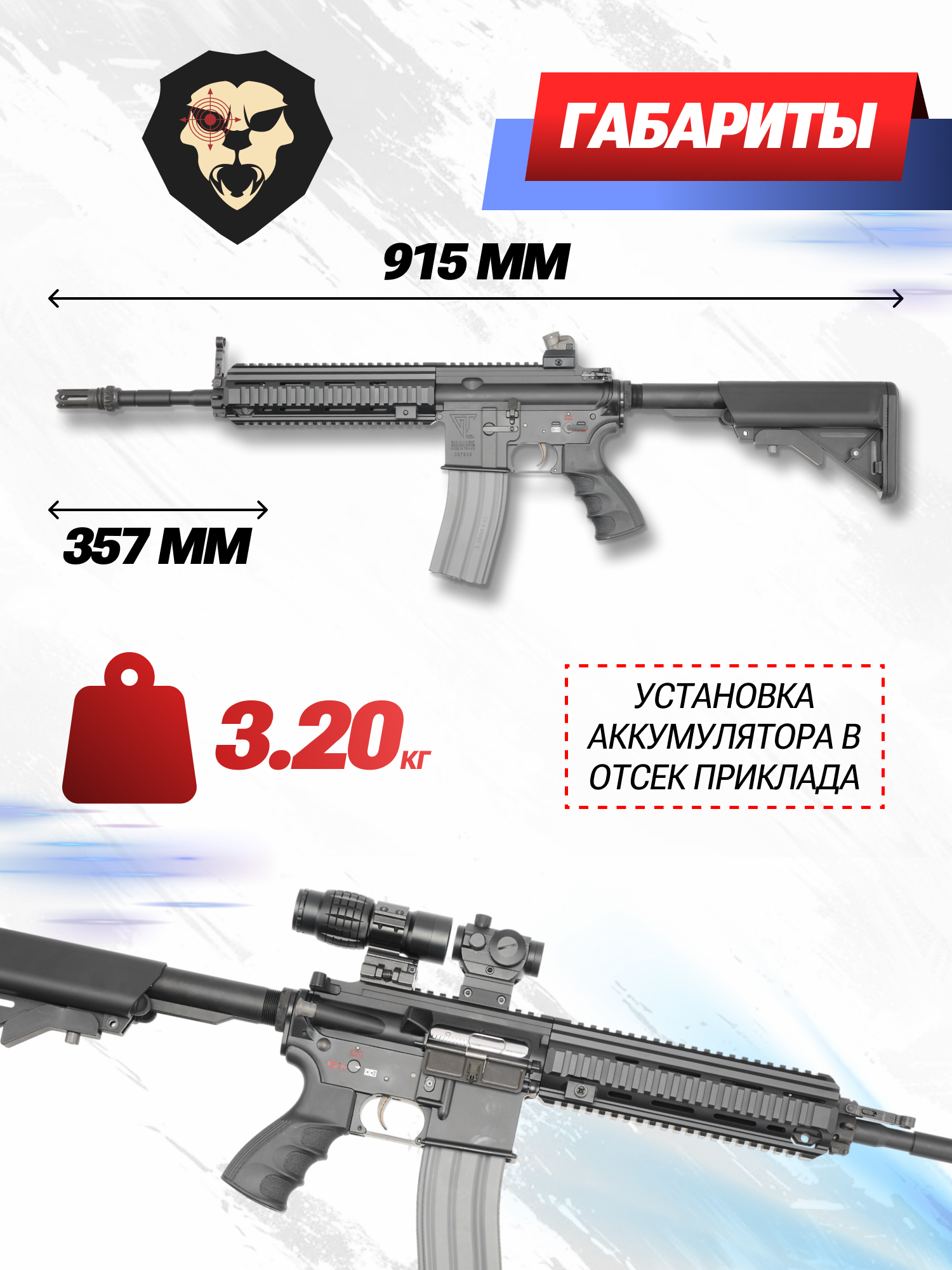 Как и оригинал, страйкбольный привод HK416 длиной 915 мм оснащается телескопическим пластиковым прикладом, внутри которого находится отсек под энергоноситель, необходимый для работы механизма пневматики. Аккумулятор подключается через защищенный от коротких замыканий разъем mini-Tamiya и запитывает электромоторчик Hi-Torque мощностью 16 тыс. об/мин. За счет раздвижного упора будущий пользователь способен скорректировать длину карабина под себя.