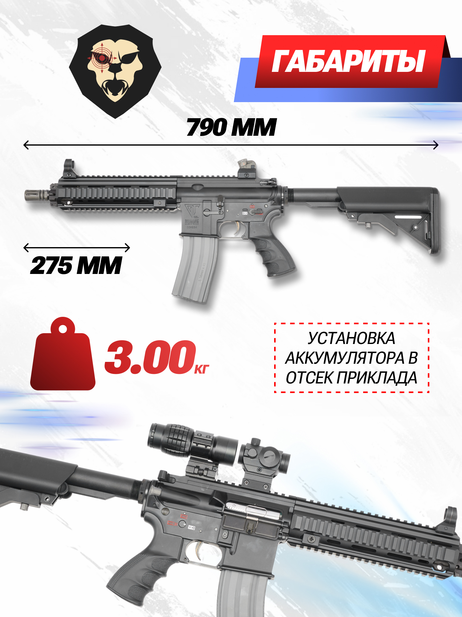 Страйкбольный привод HK416 изготавливается из сплава алюминия и повторяет размер боевого прототипа - длина привода составляет 790 мм. Благодаря телескопическому полимерному прикладу, расположенному на направляющей трубе, габарит привода дополнительно сокращается до 710 миллиметров.