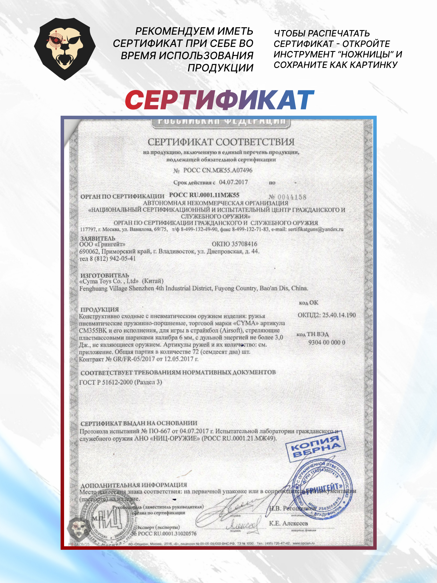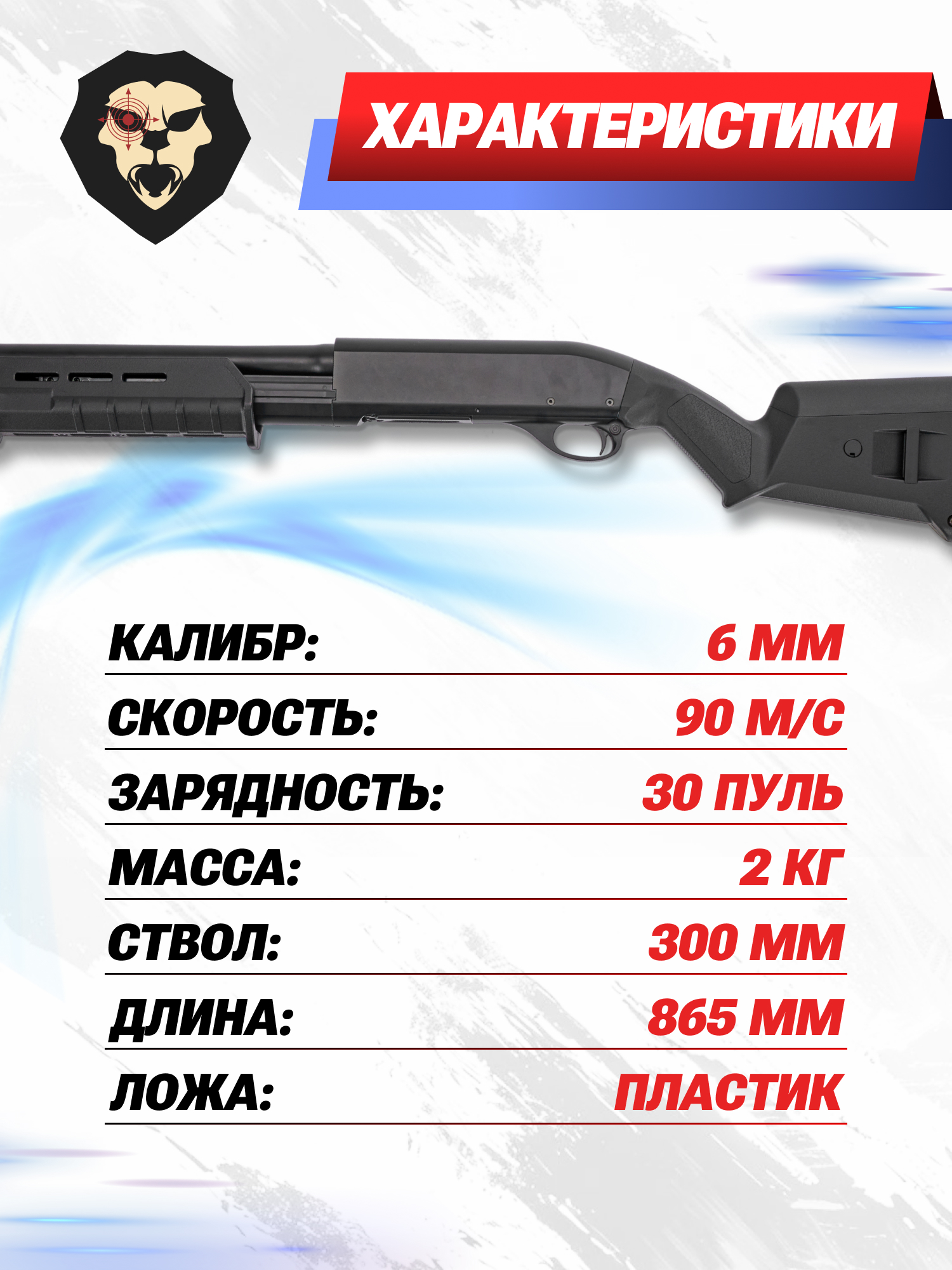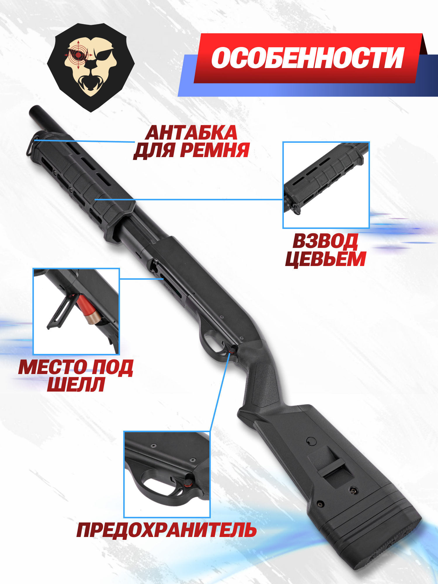 | Комплектация | Страйкбольный дробовик, шелл - 3 шт, патронташ, лоадер, упаковка, краткая документация, копия сертификата (по запросу покупателя) |
