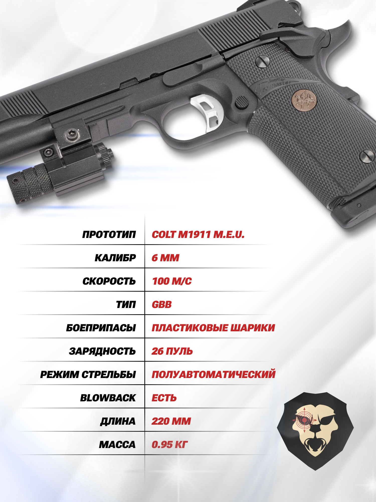 Производитель регулярно выпускает на рынок аирсофт пневматики новинки и модификации уже созданных линеек пистолетов. Из их числа внимания заслуживает страйкбольный Colt M1911 M.E.U. Боевым прототипом выступает версия, разработанная специально для сил морской пехоты США - она отличается более эргономичной рукоятью и наличием посадочной планки Weaver под дополнительный тактический обвес вроде фонарей или ЛЦУ.