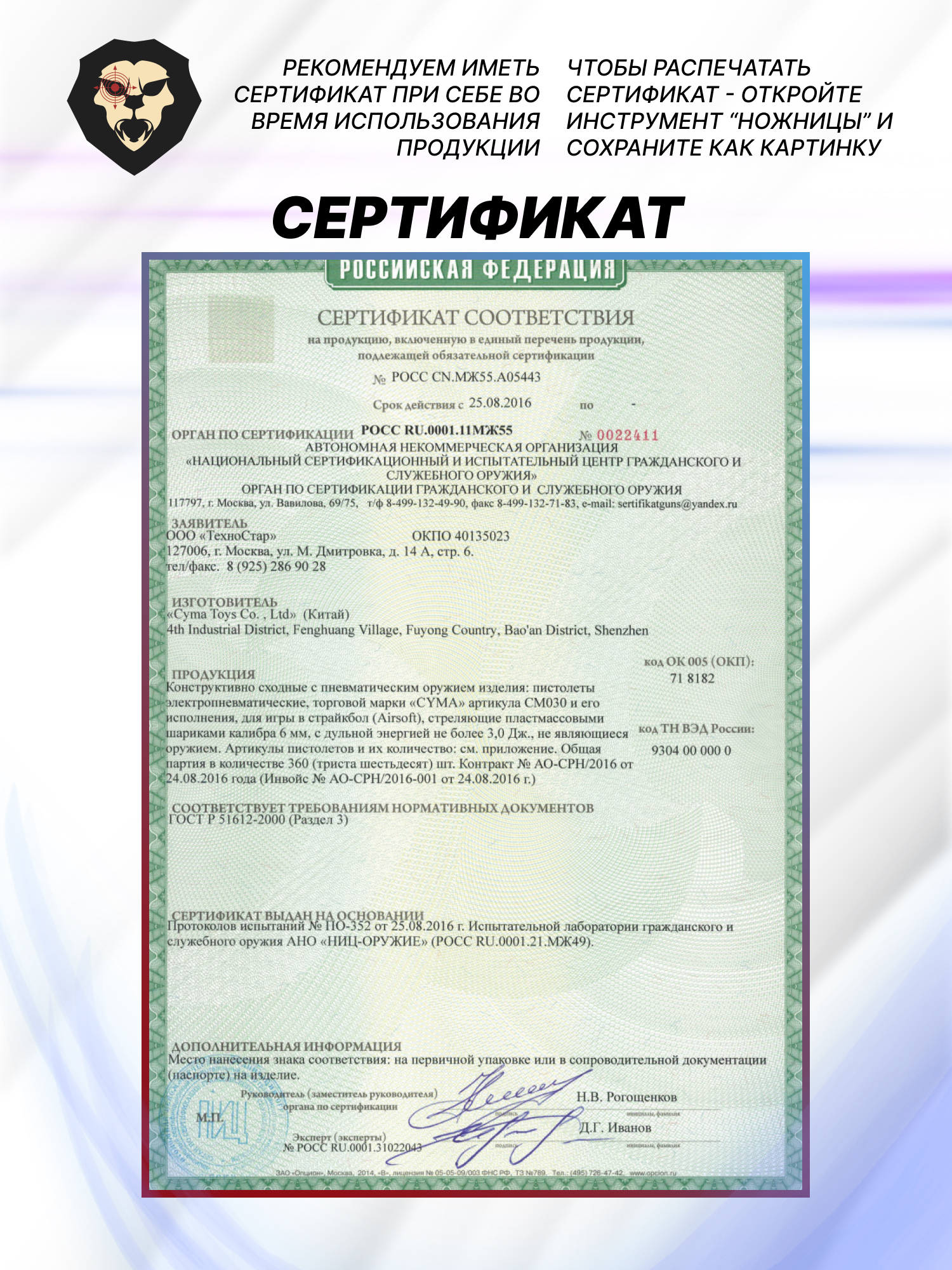 | Комплектация | Пистолет, магазин, аккумулятор, зарядное устройство, лоадер, шарики, краткая документация, копия сертификата (по запросу покупателя) |
