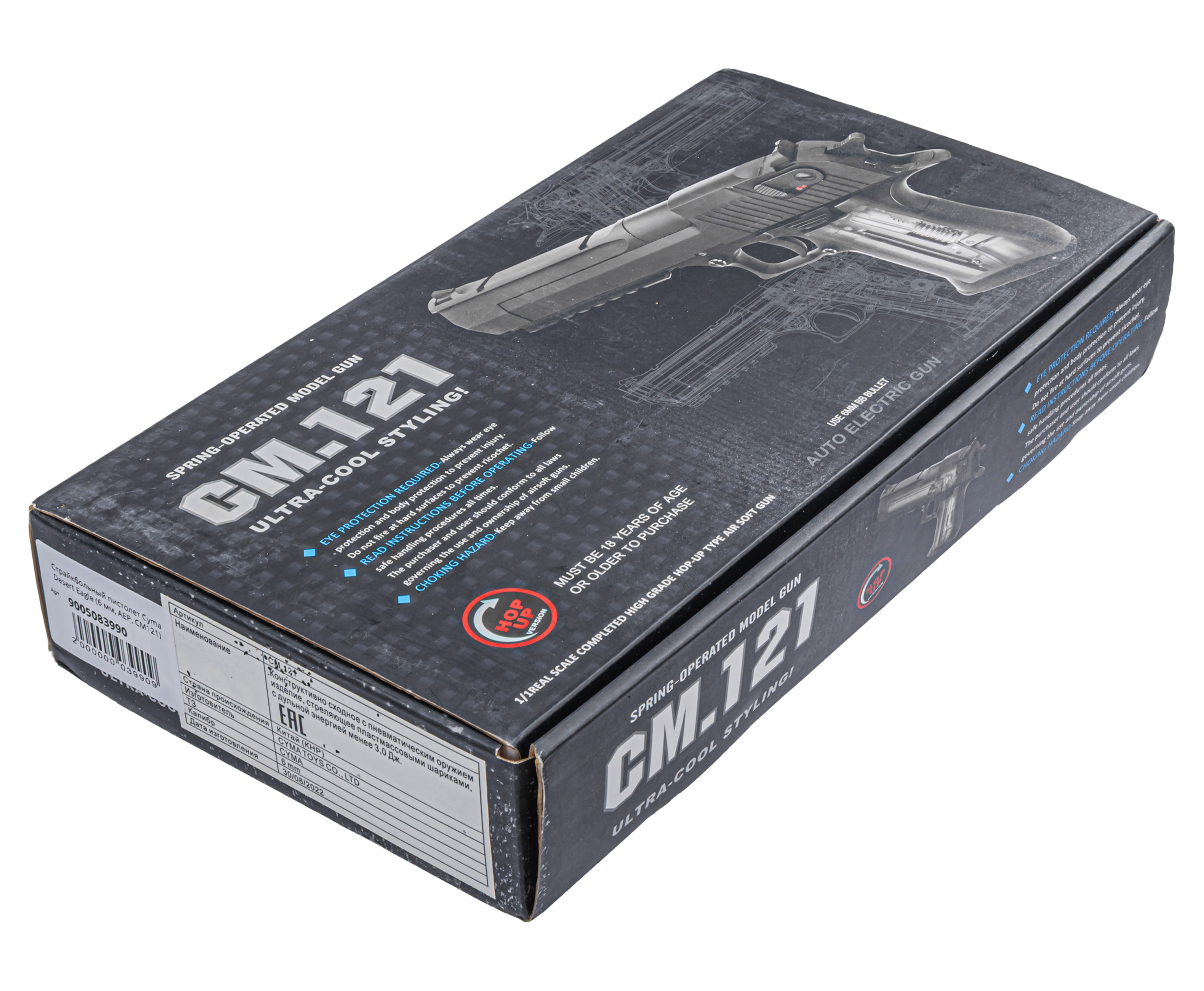 Пистолет Cyma Desert Eagle в деталях воссоздает внешнее строение огнестрельной версии. Длина модели CM121 составляет 26.5 см, а масса изделия не превышает 910 гр, что значительно легче боевого прототипа - это стало возможным благодаря использованию рамы из ударопрочного ABS-пластика. Слайд при этом изготавливается из металла и для защиты поверхности от воздействия коррозии обрабатывается порошковым составом черного цвета.