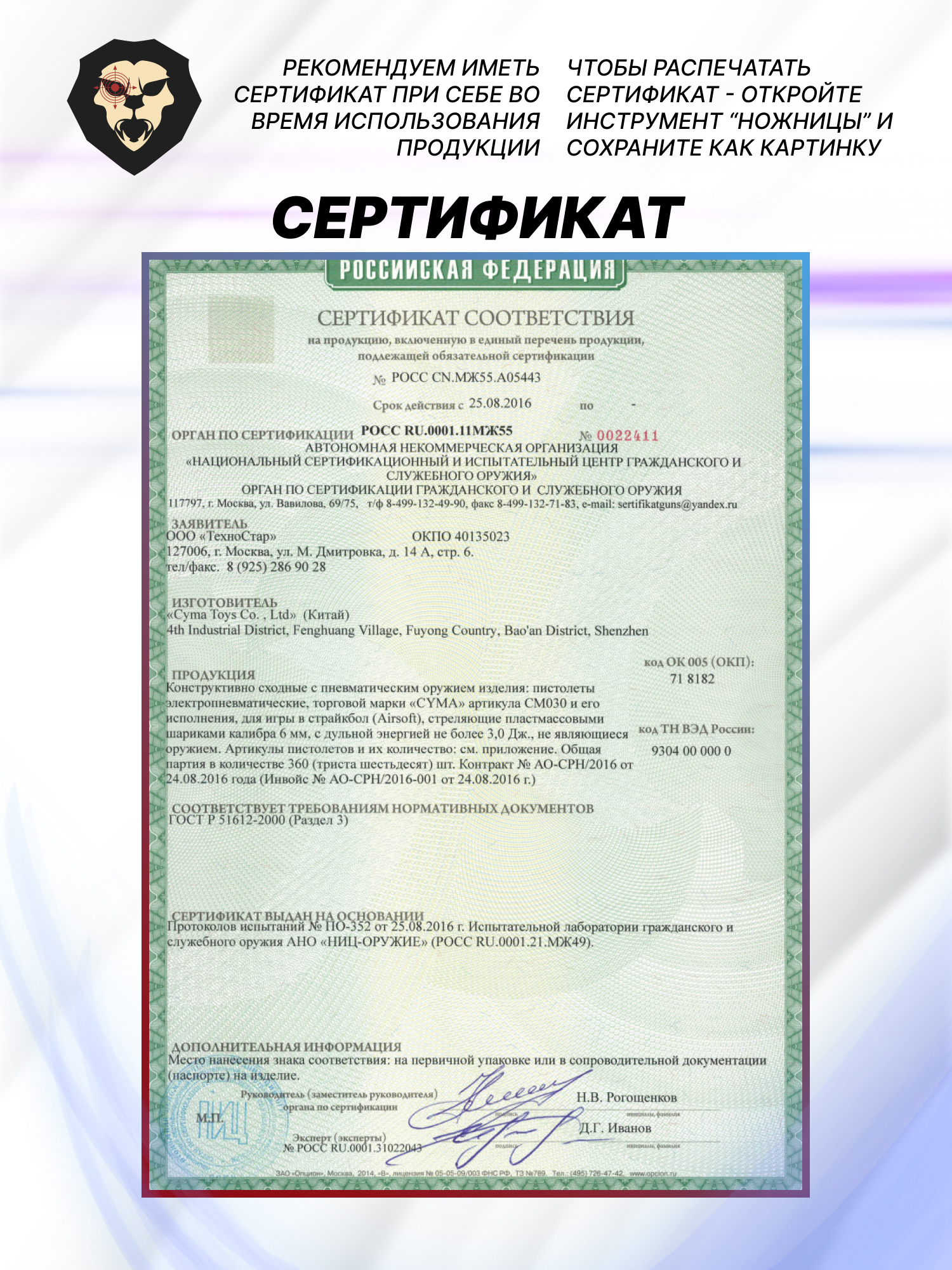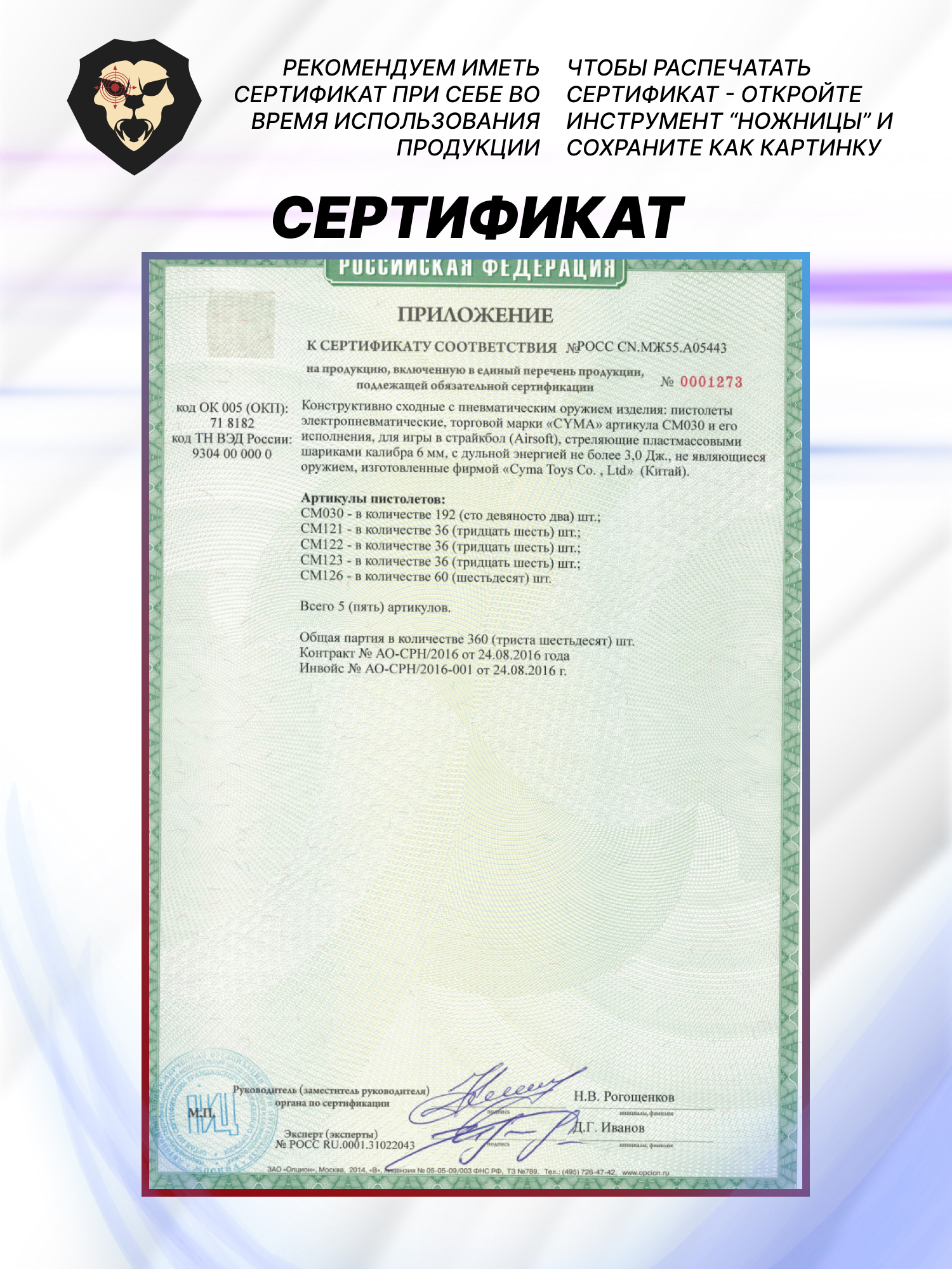 | Комплектация | Пистолет, магазин, аккумулятор, зарядное устройство, лоадер, шарики, краткая документация, копия сертификата (по запросу покупателя) |