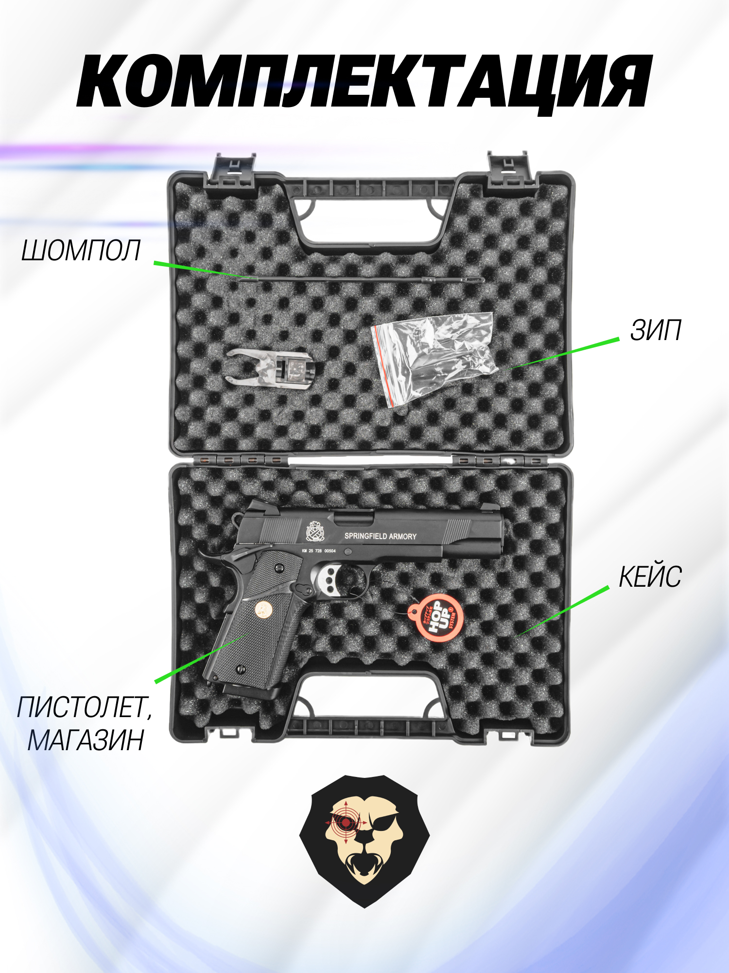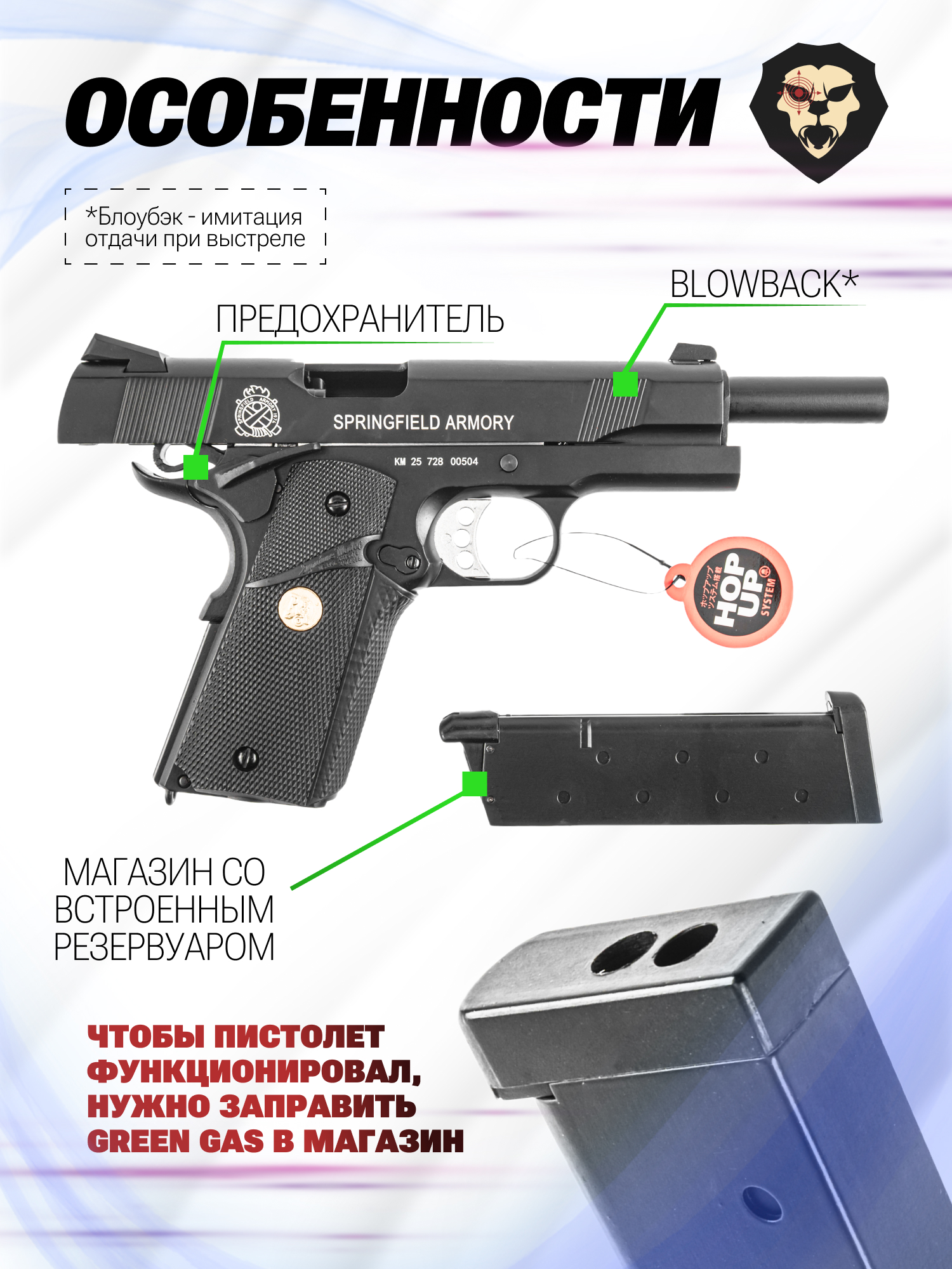 Страйкбольный пистолет Colt 1911 опирается на стандартный, для таких моделей, тип питания - за отвод затвора и полет пластиковой пульки здесь отвечает пропановая смесь Green Gas. Ее потребуется заправить в порт магазина - процесс похож на наполнение зажигалки газом. Грин газ щадящим образом воздействует на механику изделия, что продлевает ресурс.