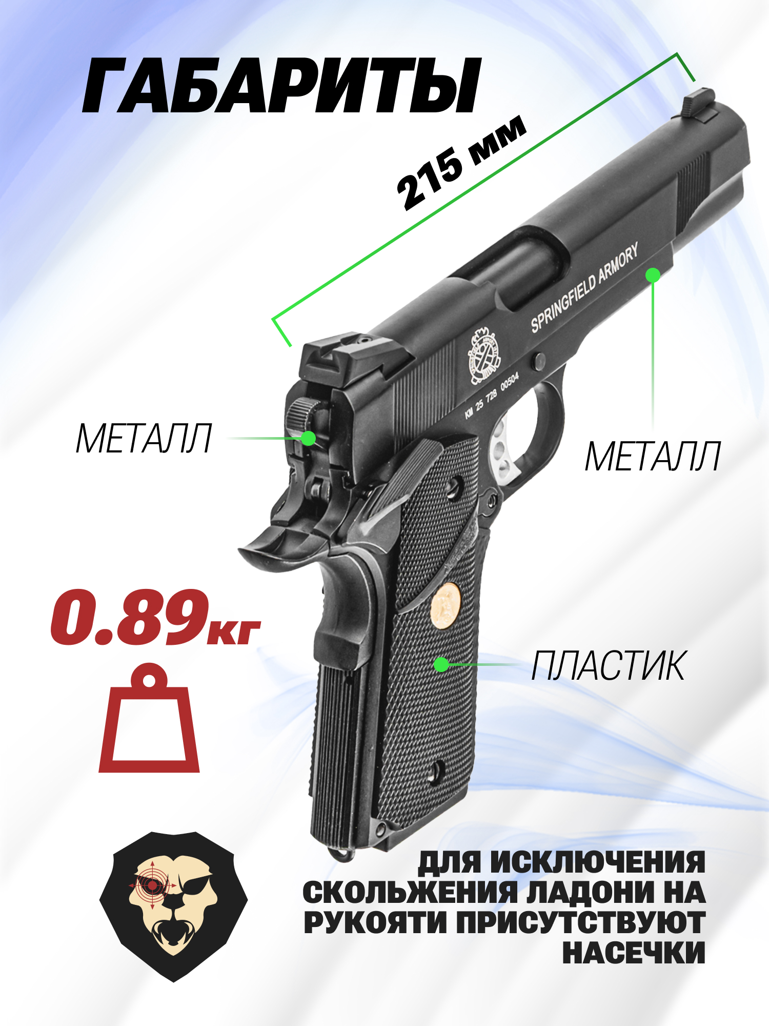 Взяв оружие в руки, пользователь сразу же почувствует приятную тяжесть - Кольт весит 890 грамм, что сопоставимо по массе с боевым прототипом, а значит ощущения от его использования будут реалистичными. Вес обусловлен материалом, из которых делают элементы корпуса - рамка и затвор здесь металлические. Кроме аутентичности это придает пневматике дополнительную прочность.