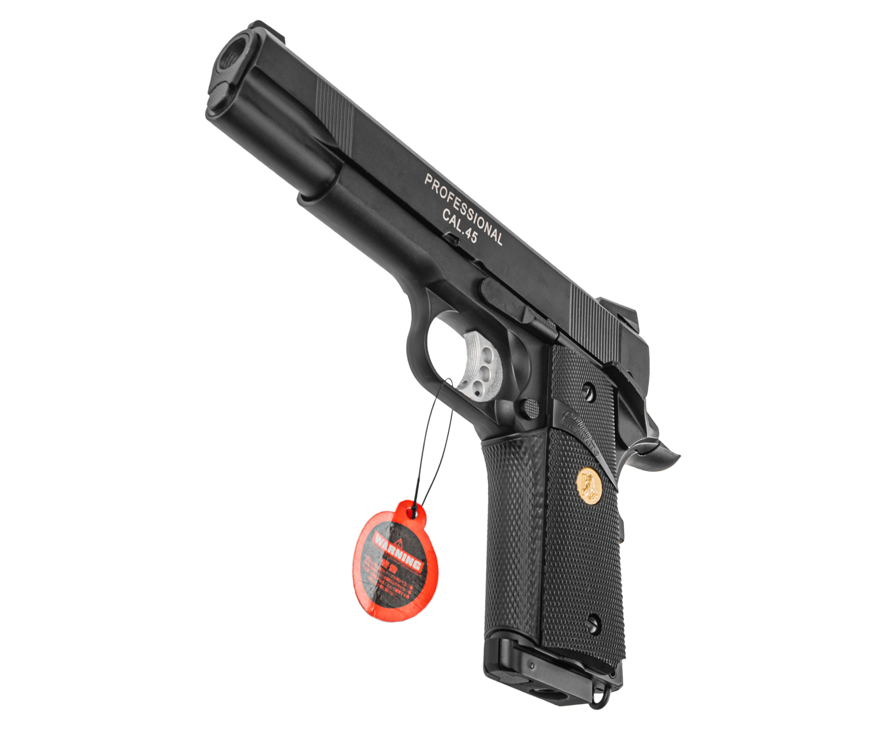 Страйкбольный пистолет Кольт 1911, в отличие от большинства аирсофт GBB моделей, работает не от Грин Газа. Здесь применяются знакомые многим любителям пневматики баллончики с СО2. Последние позволяют работать пистолету на верхней границе потенциала - скорость пульки может достигать 110-120 метров в сек, что делает поражение мишени уверенным на любом диапазоне пистолетных дистанций.
