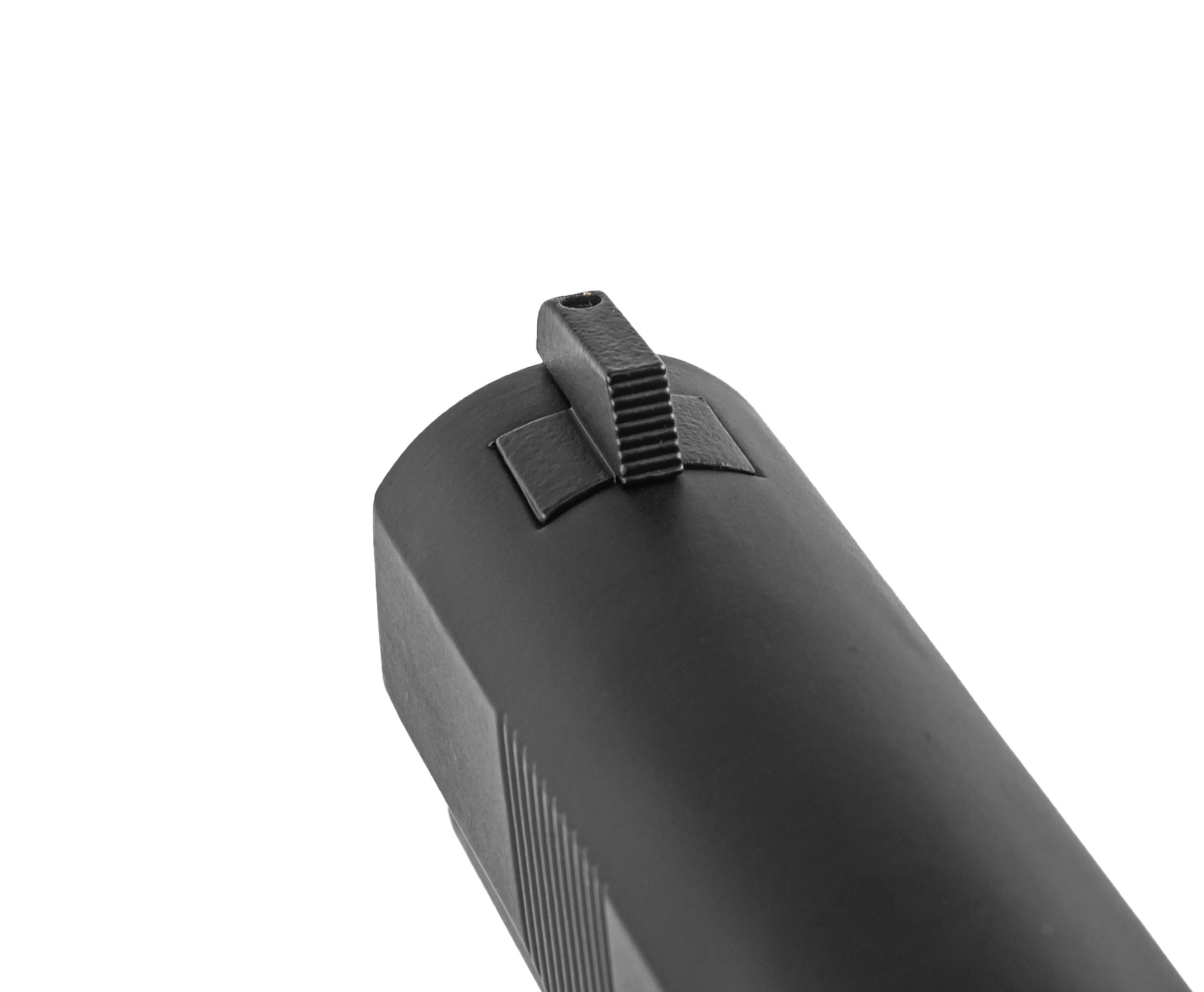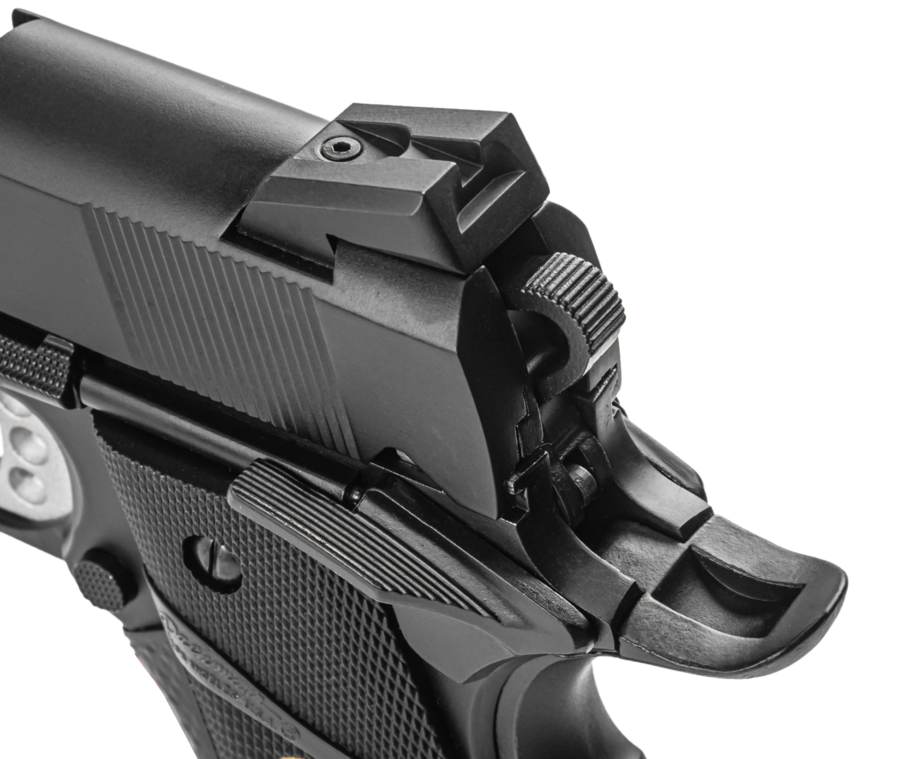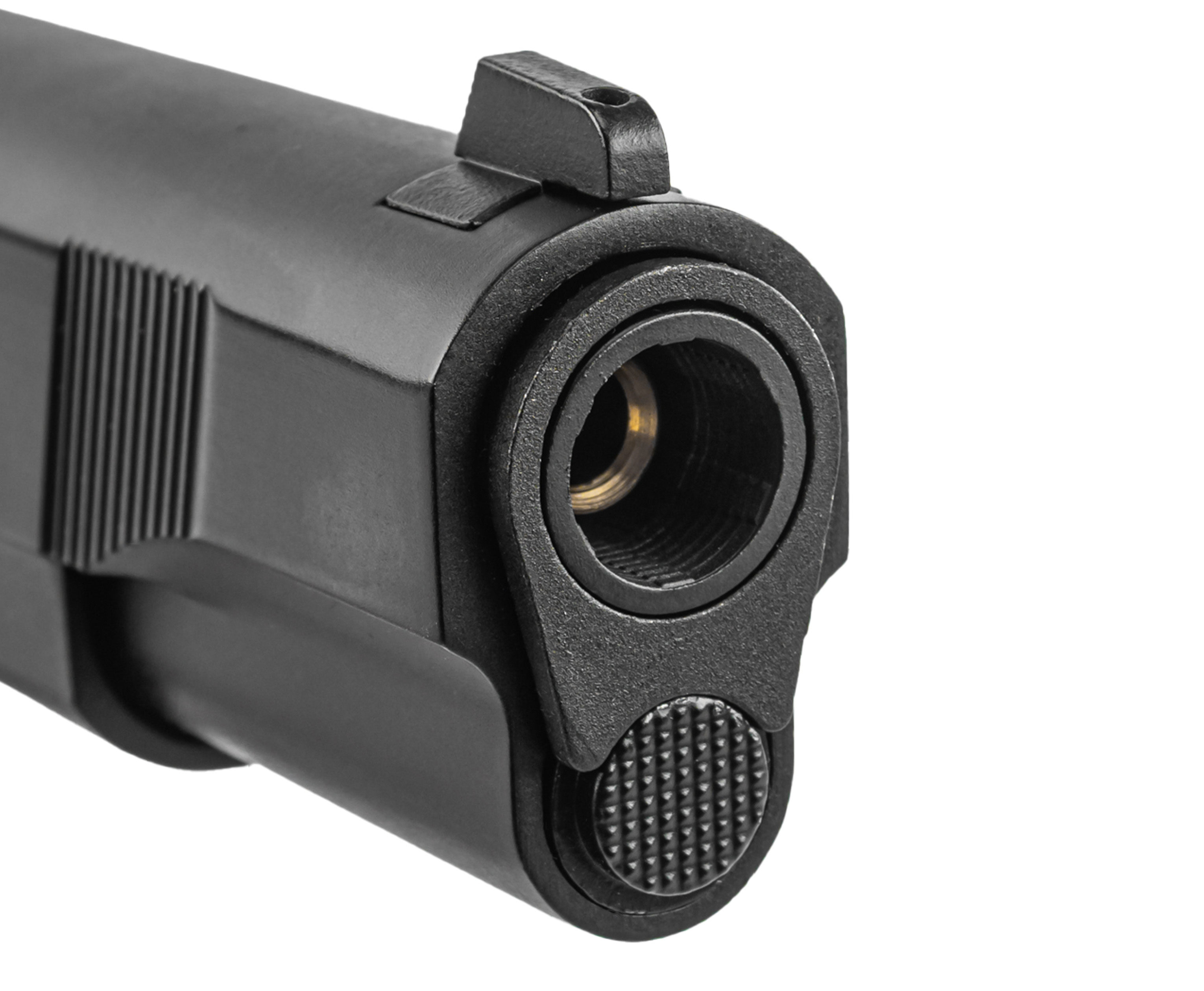 Пистолет весит 880 грамм, что сопоставимо с прототипом - ощущения от удержания Double Bell 1911 соответствующие. Массу достигают за счет выполнения рамки и затвора изделия из металла, что также повышает его надежность. Поверхности деталей изготовили в черном цвете с белыми маркировками как на боевом Кольте.