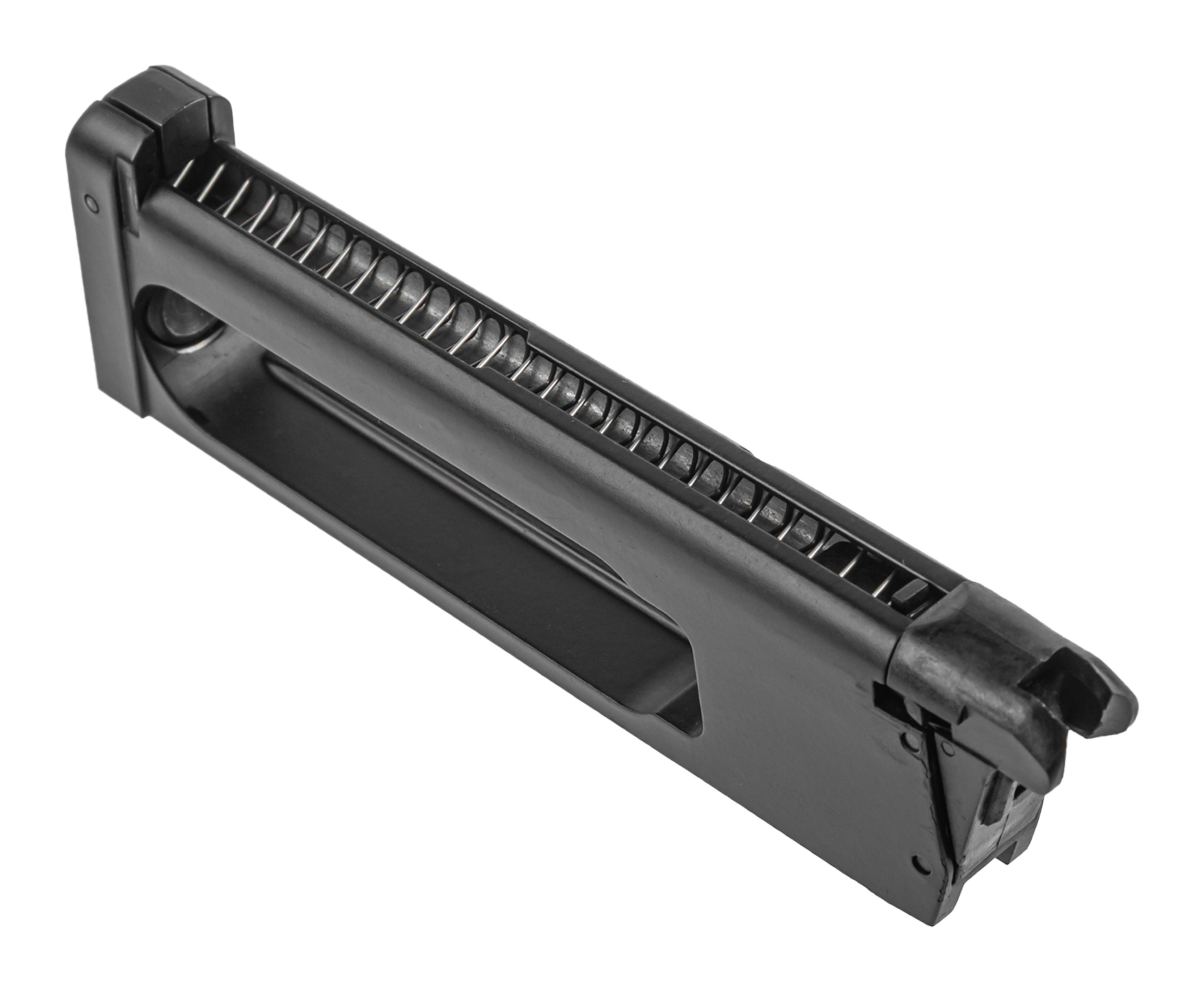 Баллоны емкостью 12 грамм устанавливаются в магазин, что упрощает перезарядку, вместе с чем делает его антуражнее - по размерам он схож с настоящим. После размещения в специальном вырезе потребуется проткнуть горловину баллончика с помощью винта поджима. Последний разместили в нижней части.
