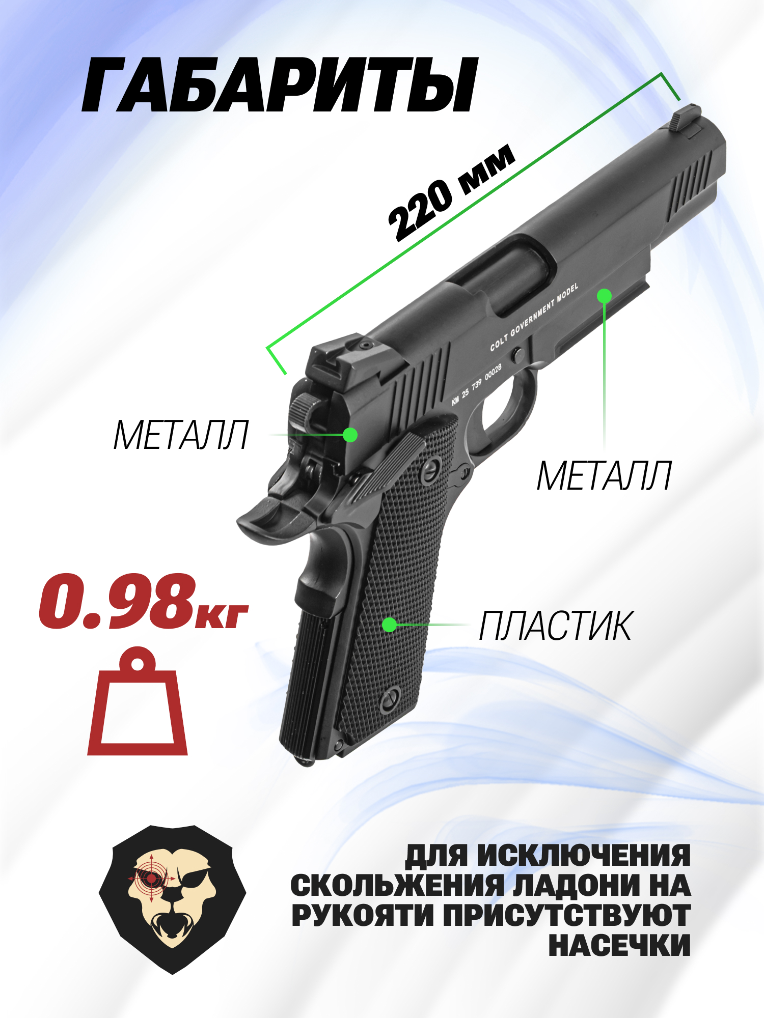 Рассматриваемая модель в точности воспроизводит модификацию Кольта М45А1, которая находится на вооружении Соединенных Штатов Америки - им пользуются такие военные формирования, как морская пехота и силы специального назначения. Образец выступает современным решением тактического и комфортного Браунинга - его появление обуславливается желанием сформировать конструкцию, пригодную для боевых действий в 21 веке. Например - на рамке под стволом у огнестрельного и обозреваемого пневматического экземпляра добавлена платформа Weaver, позволяющая монтировать ЛЦУ или фонарик.