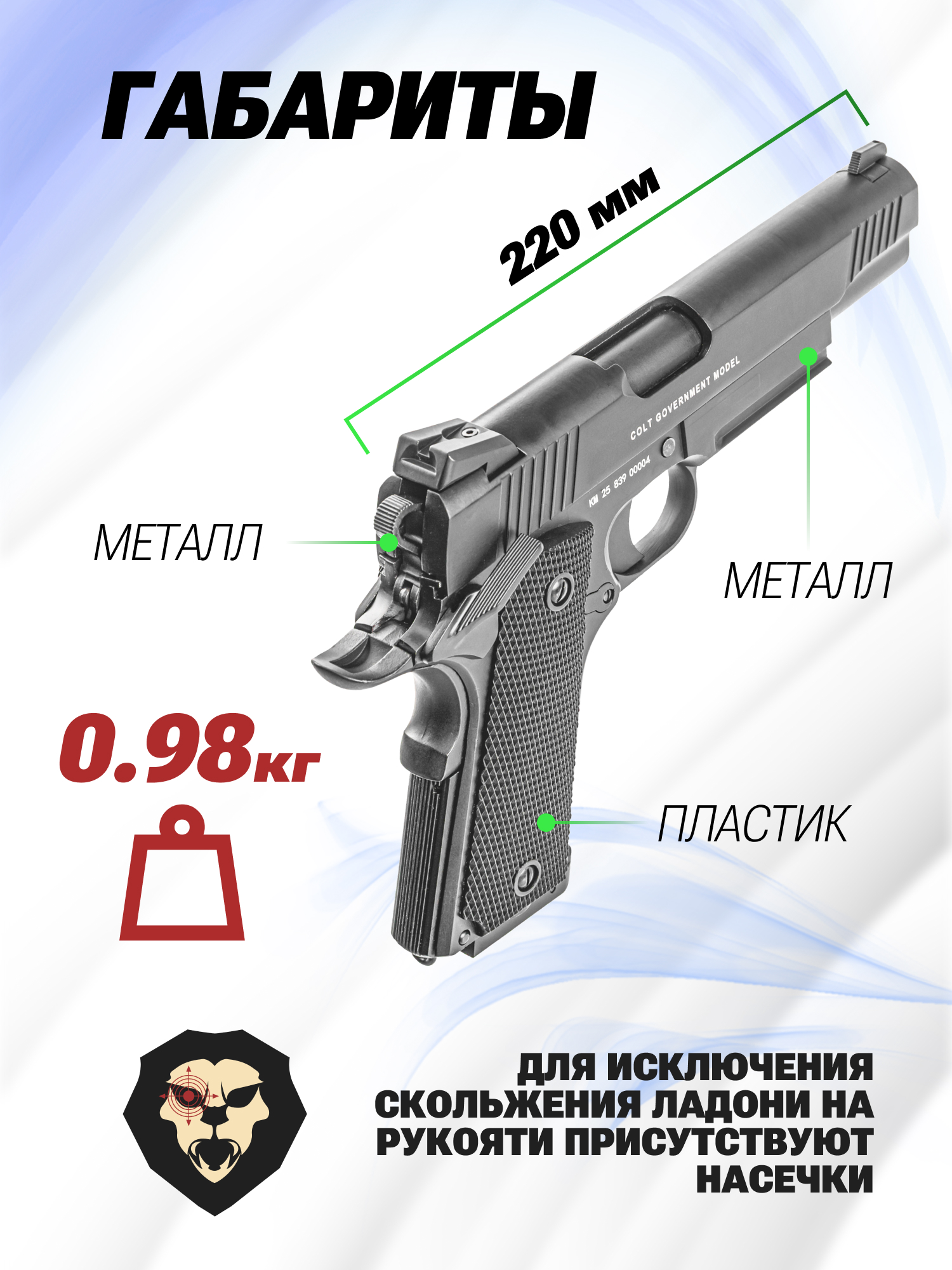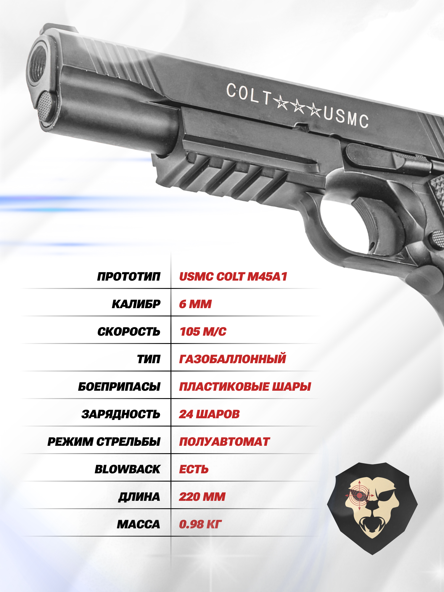 Рассматриваемый экземпляр в мельчайших деталях воссоздает современную модификацию M45A1, которая стоит на вооружении морской пехоты и сил специального назначения США. Пистолет в эирсофт исполнении удивит эргономическими качествами. Комфорту обращения способствует форма рукояти с нескользящими накладками и увеличенным наплывом, что упрощает извлечение из кобуры.