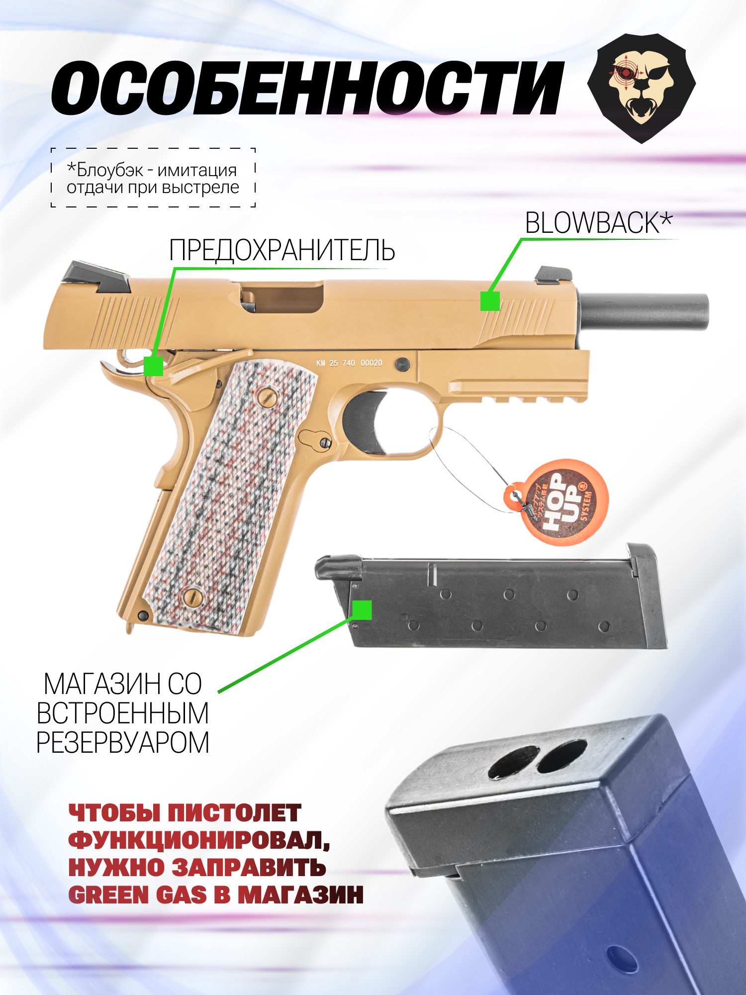Double Bell пистолеты выпускаются в нескольких конфигурациях, определяющих тип питания. В данном случае источником энергии для совершения выстрела выступает газовая смесь Green Gas. Состав закачивается напрямую из баллона в полость магазина через разъем со стороны пятки.
