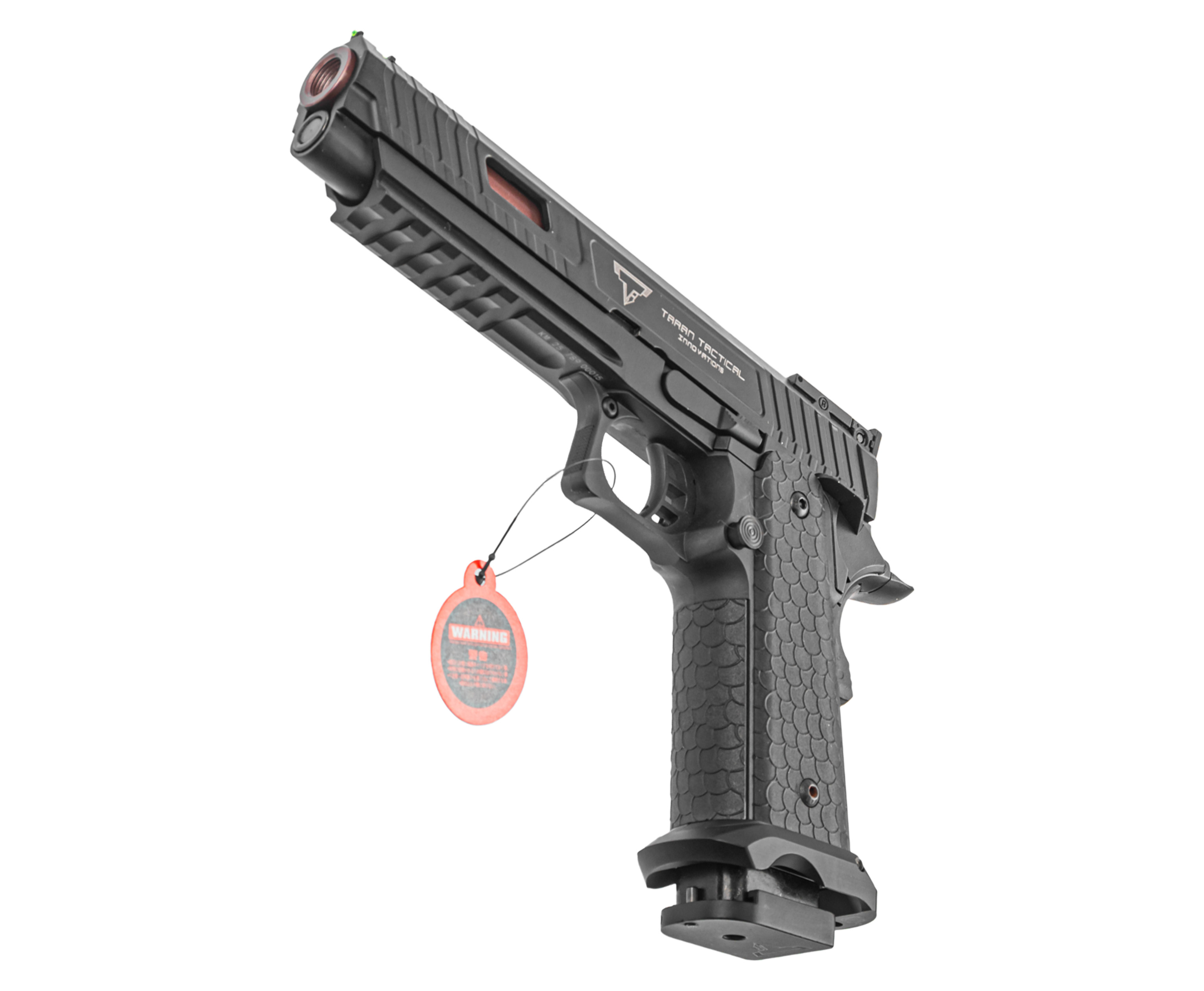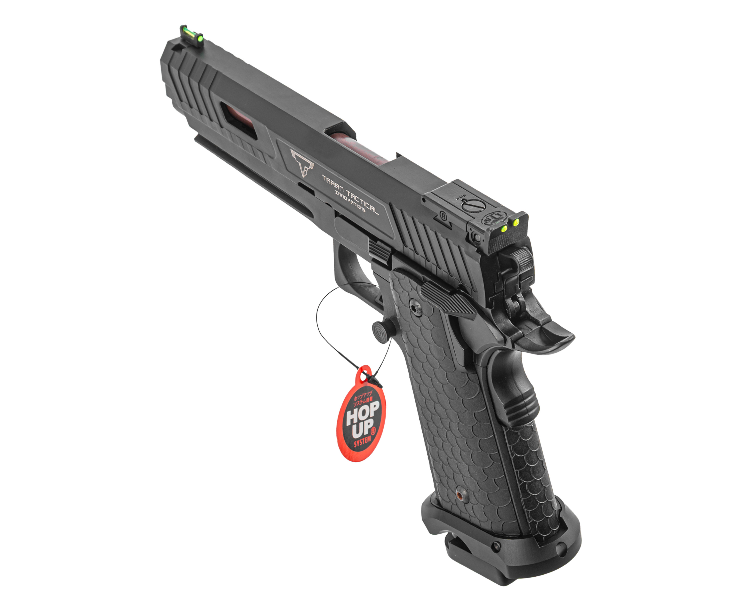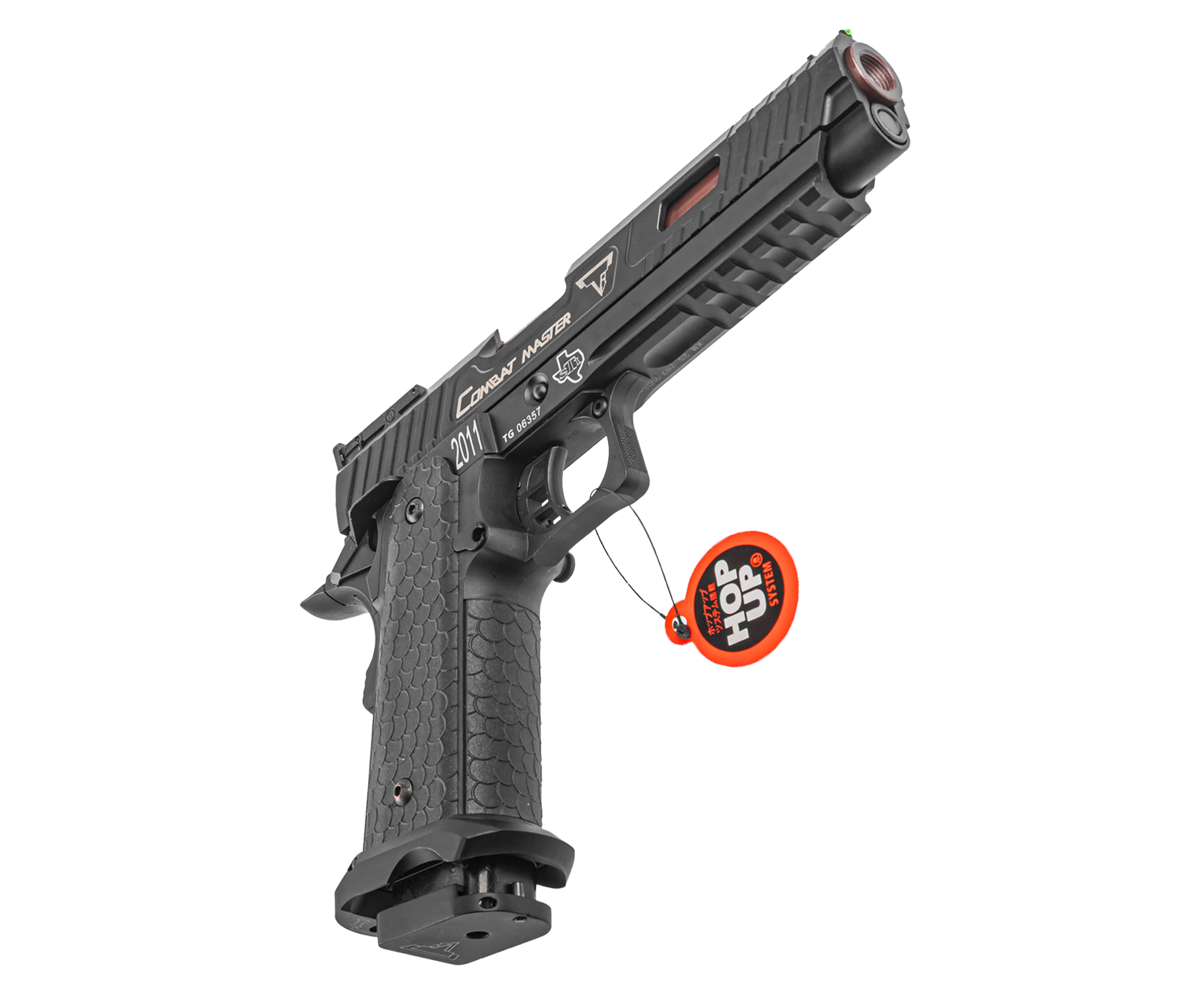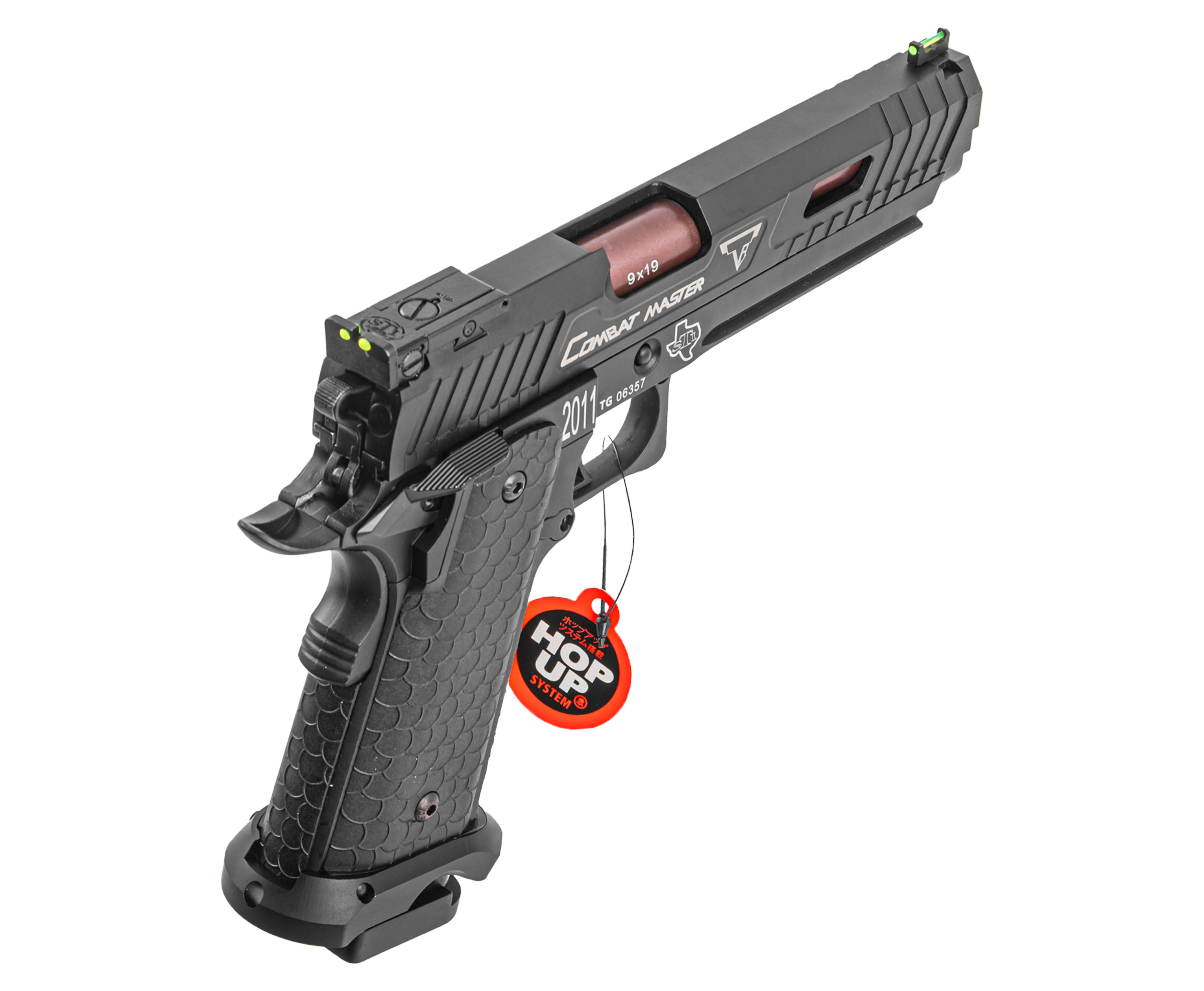 Рассматриваемый пистолет TTI 2011 Combat Master является страйкбольной версией Кольта 1911 в кастомном виде - в целом, на это указывает вся внешняя конструкция образца. Рукоять предусматривает накладку с особым дизайном в виде чешуи, однако ее функция остается такой же - она необходима для предотвращения скольжения ладони. Также к нововведениям относится наличие платформы Вивер под стволом, которая требуется для монтажа ЛЦУ или фонаря.