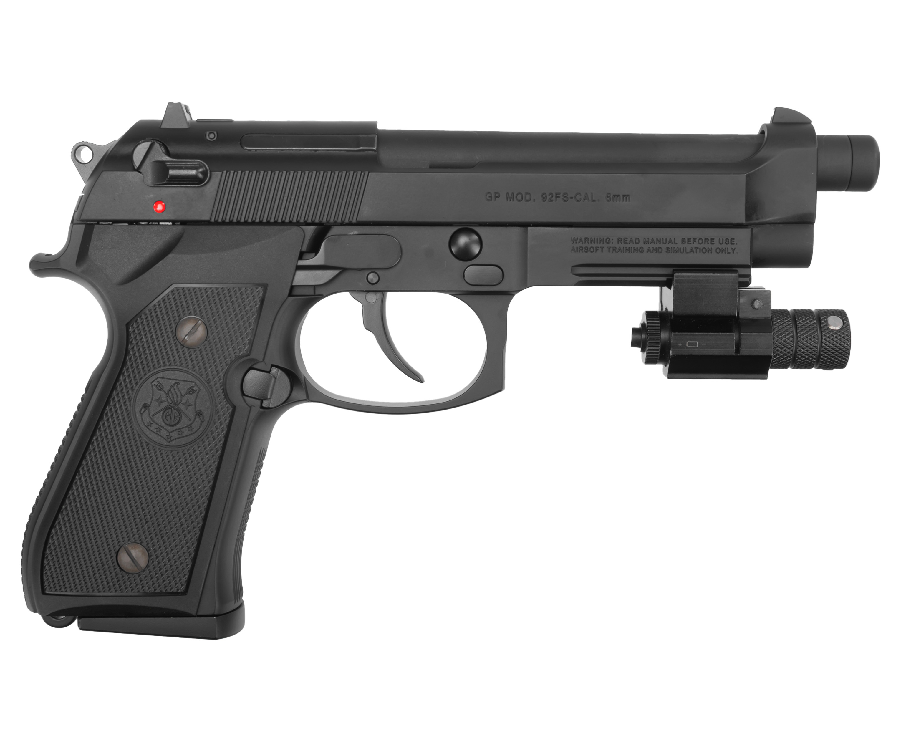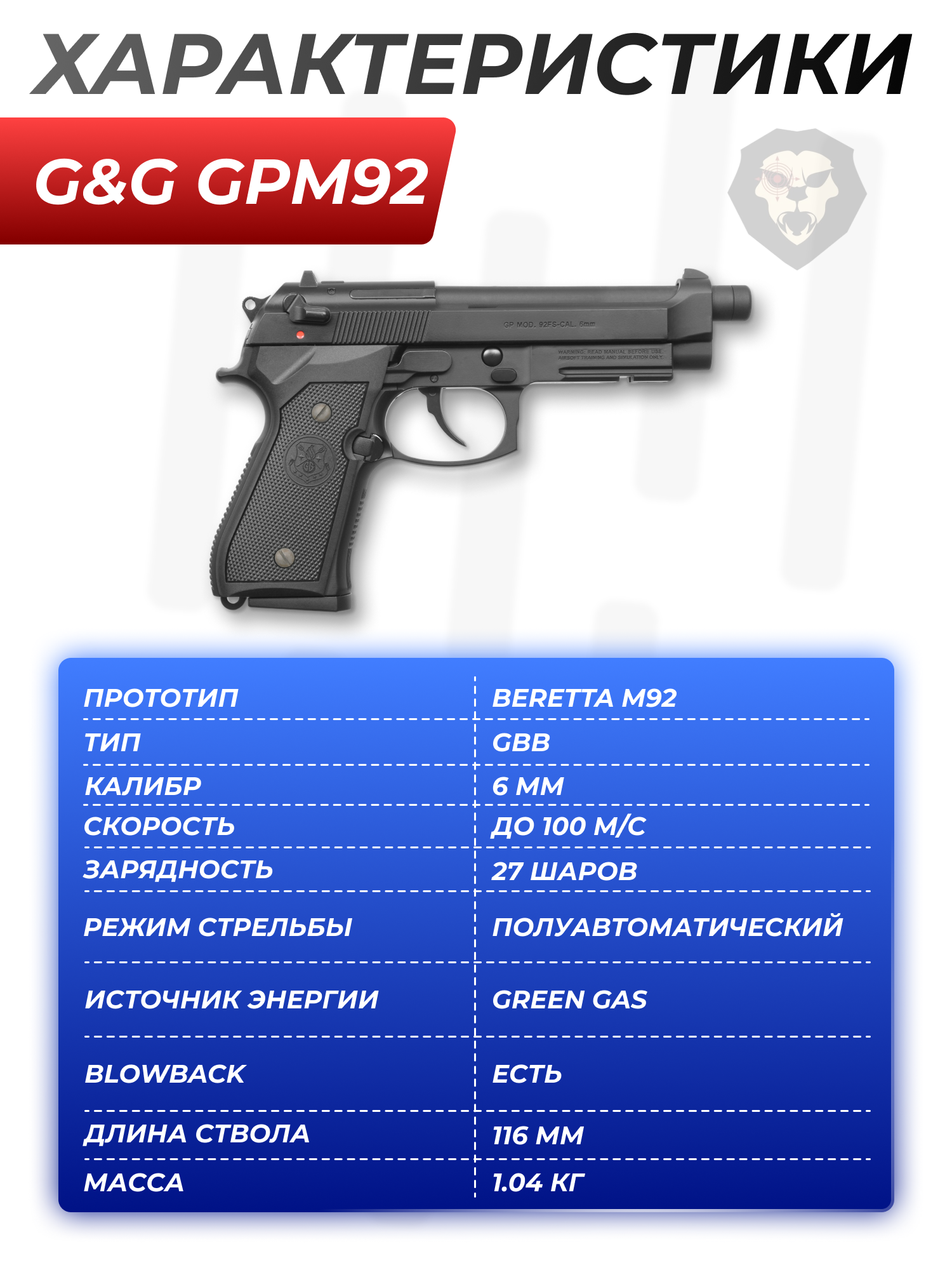 К перечню моделей, исполненных по образцу Беретта М92, относится рассматриваемый GPM92 - изделие в точности изготовлено по конструкции указанного пистолета, сохраняя практически все особенности строения. К тому же производитель предусмотрел опцию Блоубэка, то есть после каждого выстрела металлический слайд будет совершать движение, тем самым имитируя отдачу. Непосредственно после присоединения магазина кожух-затвор экземпляра требуется потянуть для последующей полуавтоматической стрельбы.