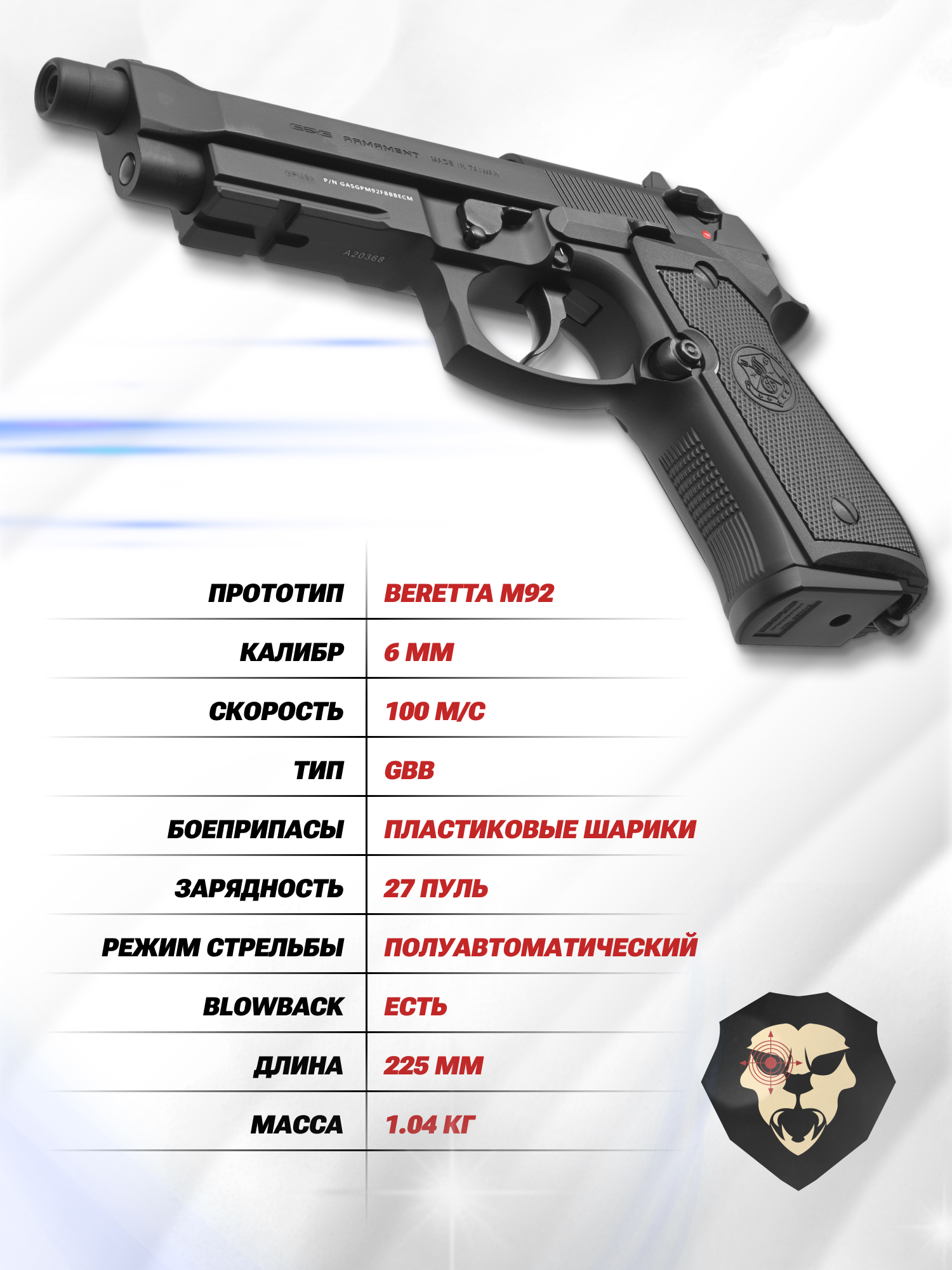 К перечню моделей, исполненных по образцу Беретта М92, относится рассматриваемый GPM92 - изделие в точности изготовлено по конструкции указанного пистолета, сохраняя практически все особенности строения. К тому же производитель предусмотрел опцию Блоубэка, то есть после каждого выстрела металлический слайд будет совершать движение, тем самым имитируя отдачу. Непосредственно после присоединения магазина кожух-затвор экземпляра требуется потянуть для последующей полуавтоматической стрельбы.