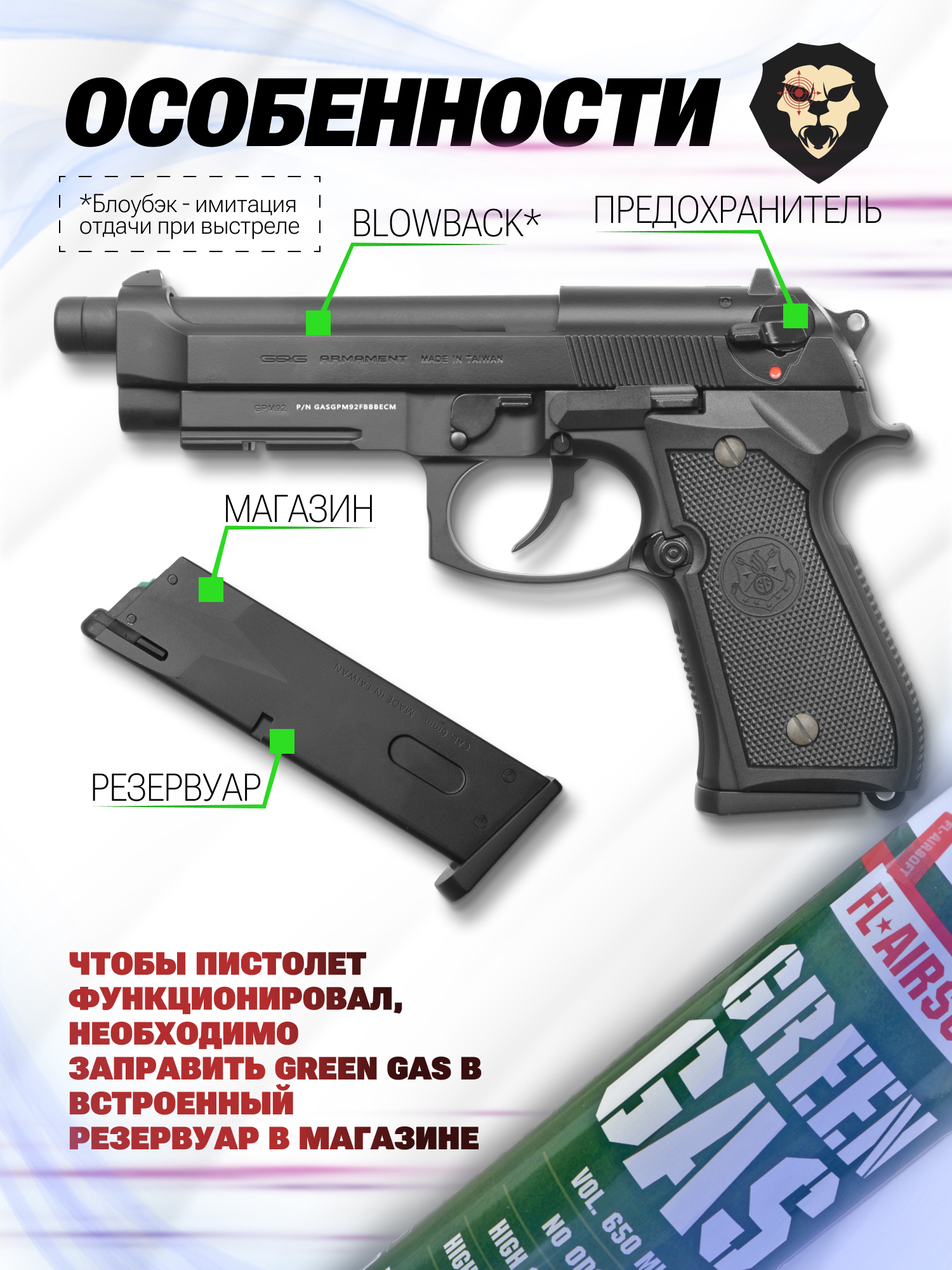 Страйкбольный пистолет G&G GPM92 (GBB, 6 мм, Green Gas, черный) купить в интернет-магазине Popadiv10.