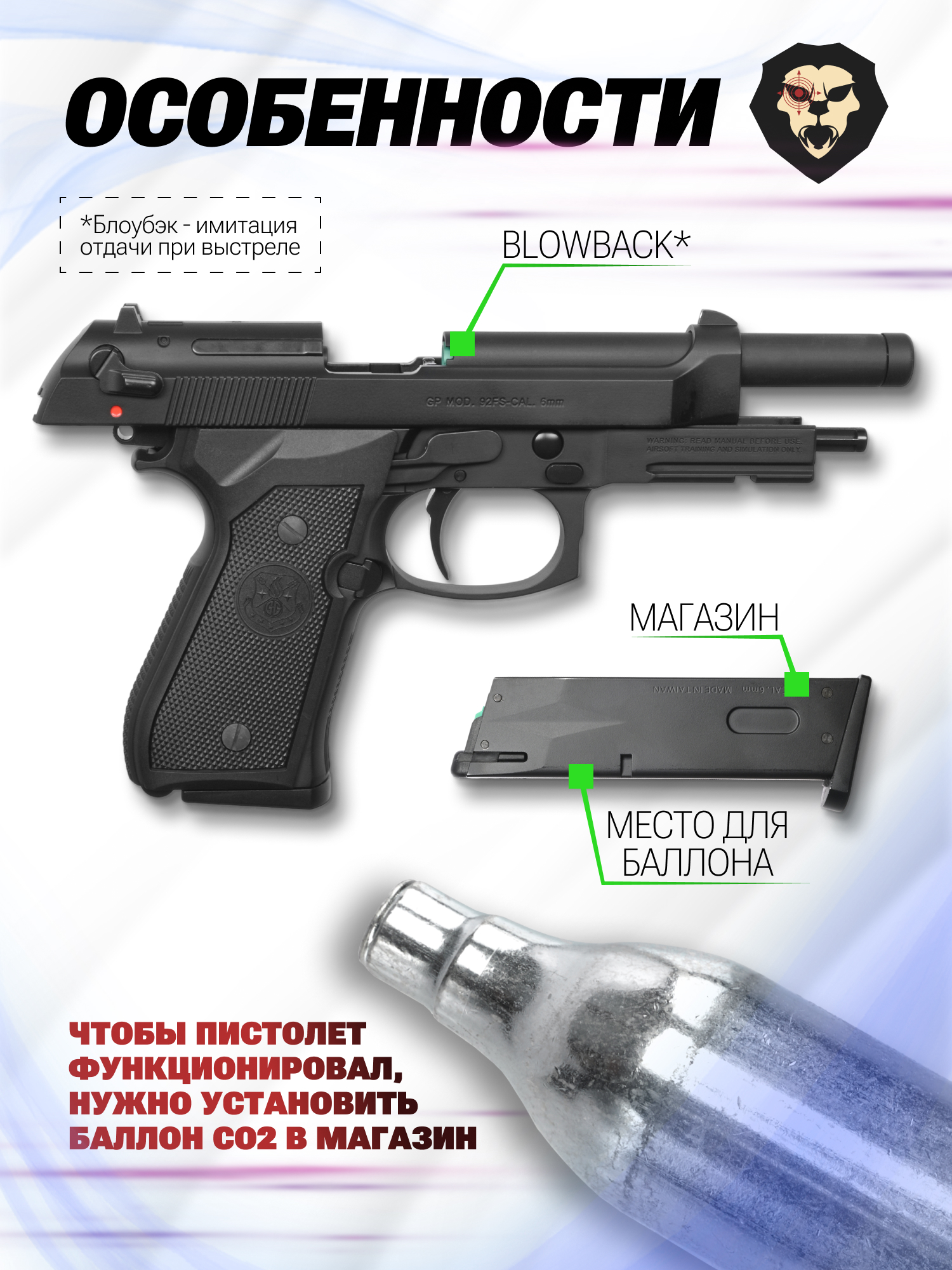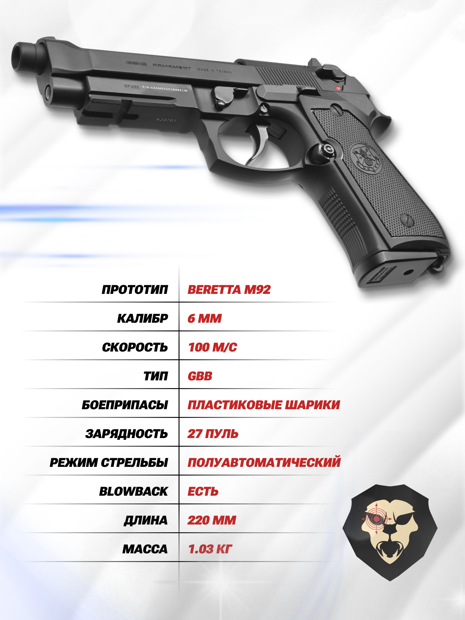 Продукция бренда отличается высокой детализацией - рассматриваемый образец не стал исключением. Изделие GPM92 в точности передает особенности итальянского пистолета Beretta. Огнестрельные модификации стоят на вооружении армии и спецподразделений США, а также европейских стран - узнаваемости серии способствует появление в кинолентах и видеоиграх.
