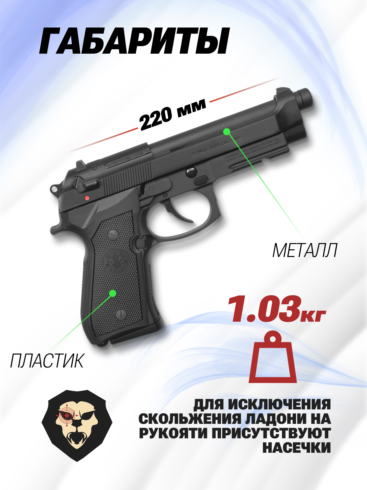Страйкбольный пистолет Беретта ГПМ92 характеризуется размером 220 мм. Рама вкупе с кожухом изготовлена из металла - накладки на рукоять, в свою очередь, выполнены из ударостойкого полимера. Такая комбинация материалов дала массу в пределах одного килограмма.