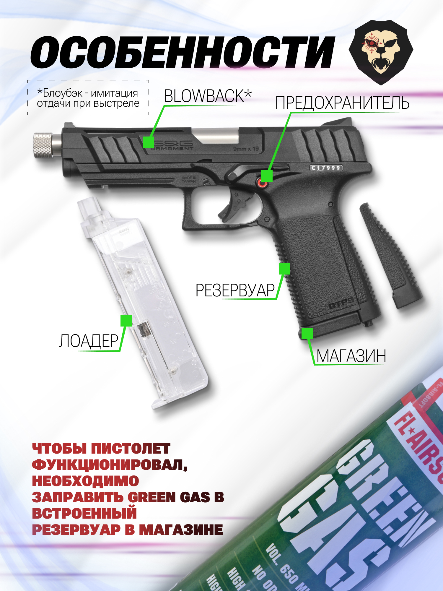 На работу оного перенаправляется часть газа, который задействуется на разгон метаемого заряда по стволу. Пистолет функционирует от смесей по типу Green Gas, закачиваемых через заправочный клапан на пятке магазина. Элемент боепитания также выполняет основную функцию и отвечает за подачу 6 мм сферических пуль.