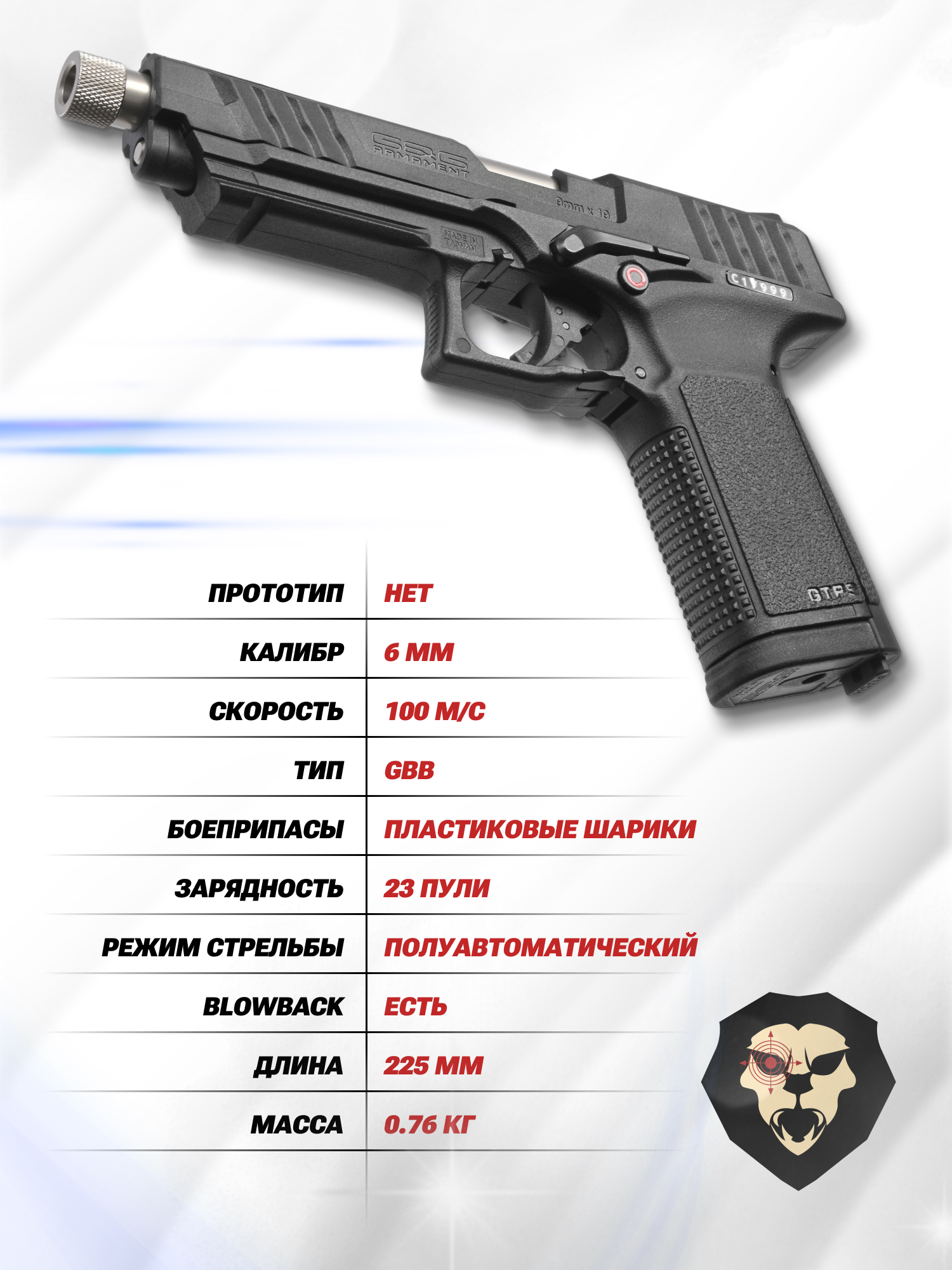 Информация о товаре "Страйкбольный пистолет G&G GTP 9 (GBB, Green Gas, black, 6 мм)" носит ознакомительный характер, и не является публичной офертой, определяемой положениями Статьи 437 Гражданского кодекса Российской Федерации, характеристики, внешний вид, цвет и комплектация могут быть изменены производителем без уведомления.