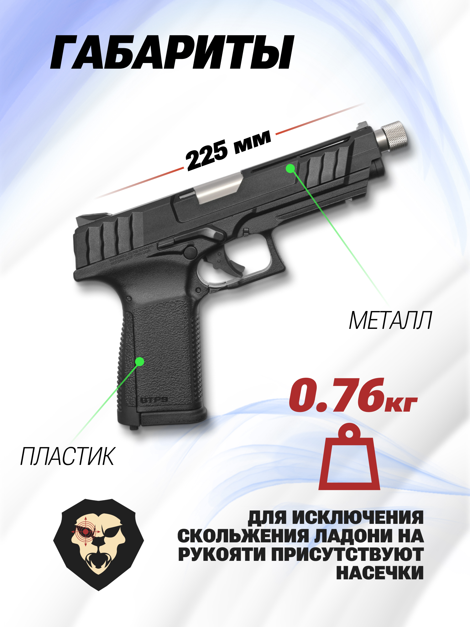 Образец получился довольно легким - масса ГТП 9 не превышает 760 грамм при длине 22.5 см. Добиться этого удалось применением деталей из современного полимера. Кожух-затвор при этом выполнен из металла и характеризуется подвижностью при стрельбе - эффект отдачи возникает за счет механизма Blowback.