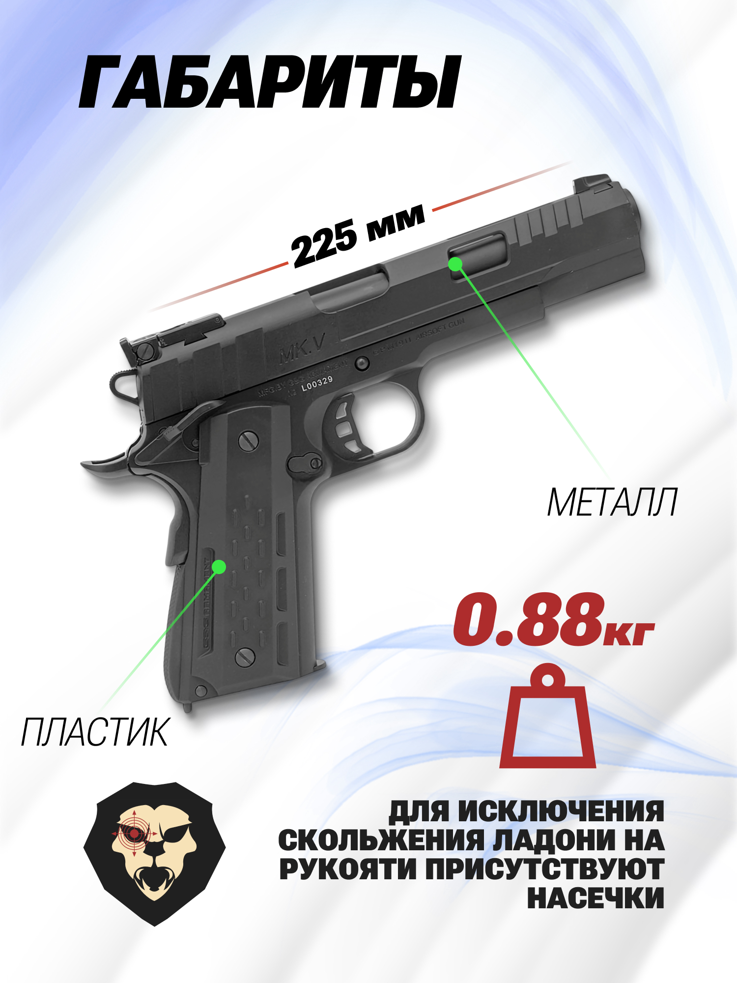 К числу последних относится рассматриваемый экземпляр, дизайн которого основан на пистолете Colt M1911. Страйкбольную версию снабдили облегченным кожух-затвором - уменьшить вес удалось благодаря вырезам по бокам и в верхней части. Как и рама, слайд изготовлен из металла, при этом рукоять оснастили съемными накладками из полимера.