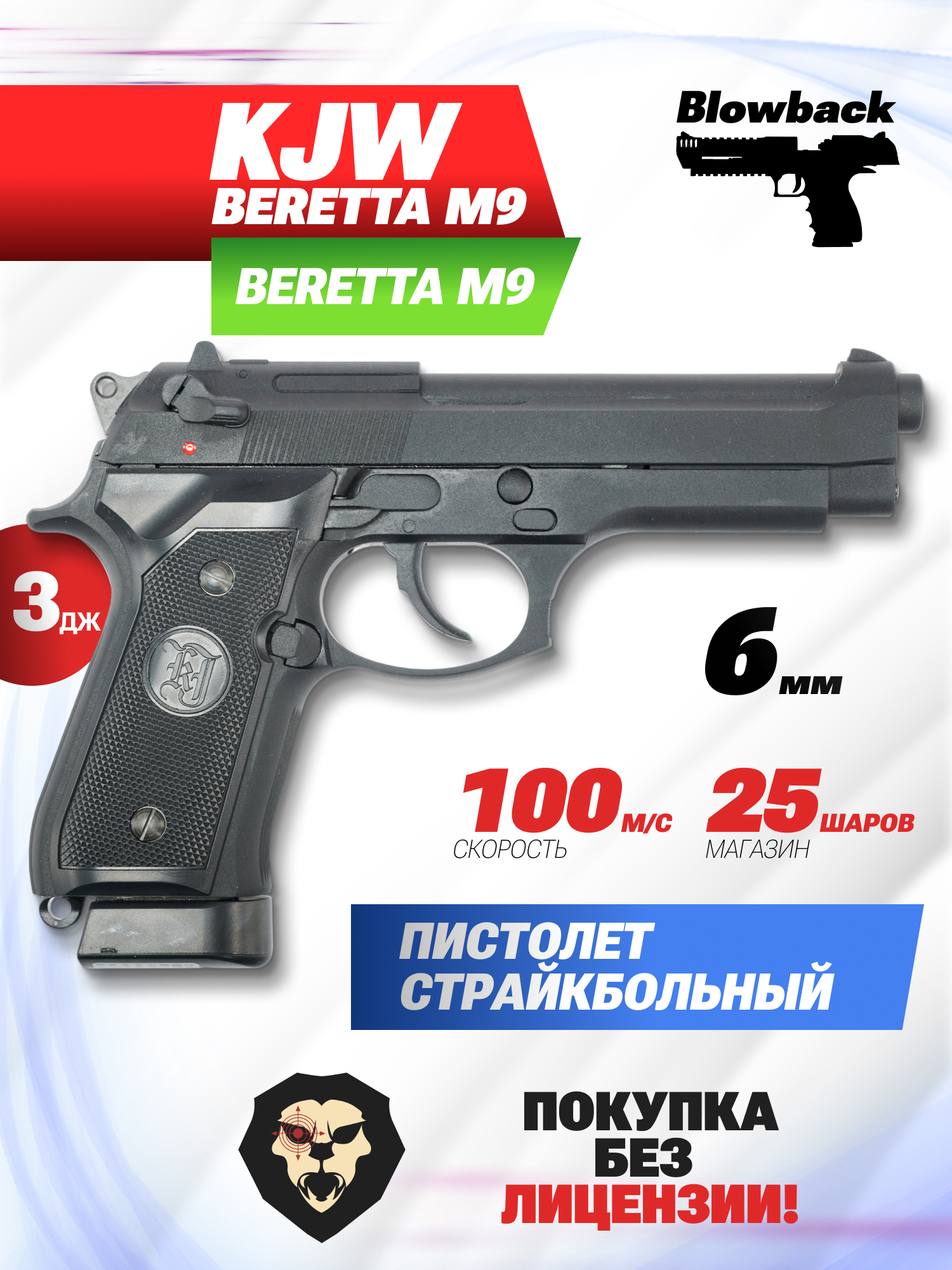 Страйкбольный пистолет KJW Beretta M9 тайванского бренда в качестве снарядов применяет пластиковые шары, диаметр которых не превышает шести миллиметров. Боепитание обеспечивается посредством использования комплектного механического магазина, вмещающего до 25-и пуль. Как и огнестрельный образец, пневматическая модель ведет стрельбу в полуавтоматическом режиме, благодаря чему исключается необходимость производить взвод после каждого выстрела.