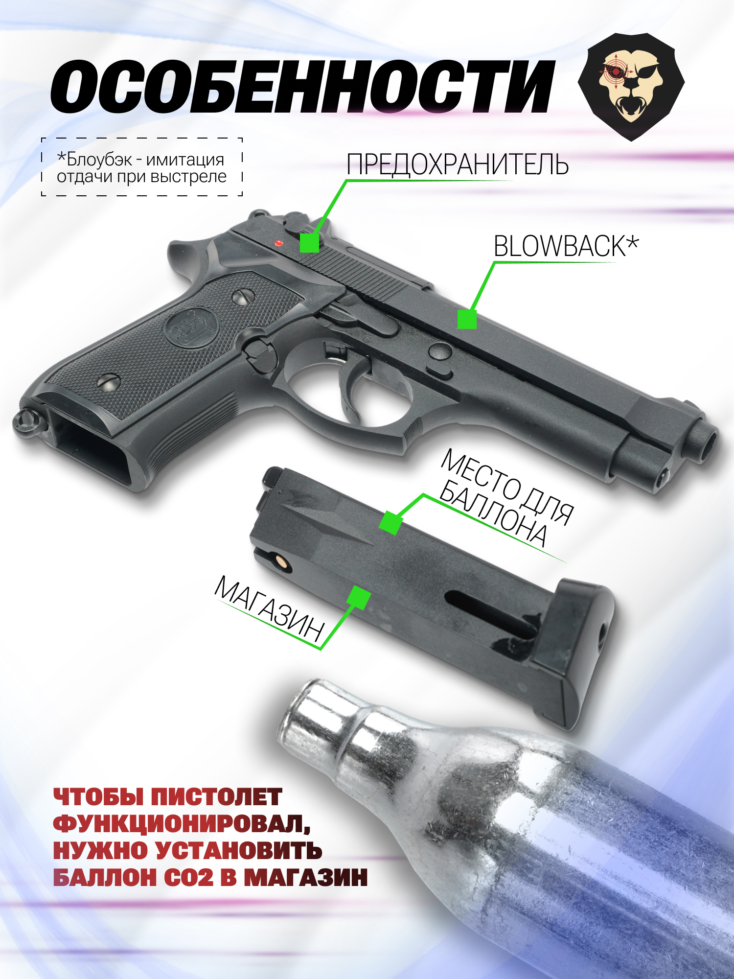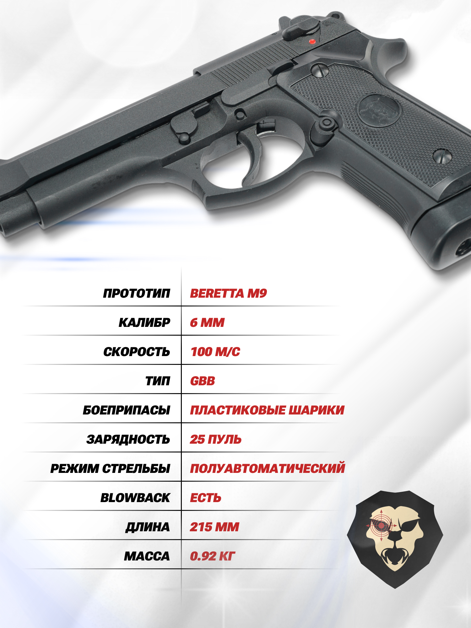 Представленная страйкбольная Беретта М9 относится к разряду газобаллонного оружия, источником энергии в котором выступает пар от закипающей в 12-граммовом резервуаре углекислоты. Покидая емкость, газ расширяется и приводит в движение заряженный снаряд. Часть энергии также затрачивается на толчок металлического слайда, имитирующего отдачу выстрела боевого оружия.